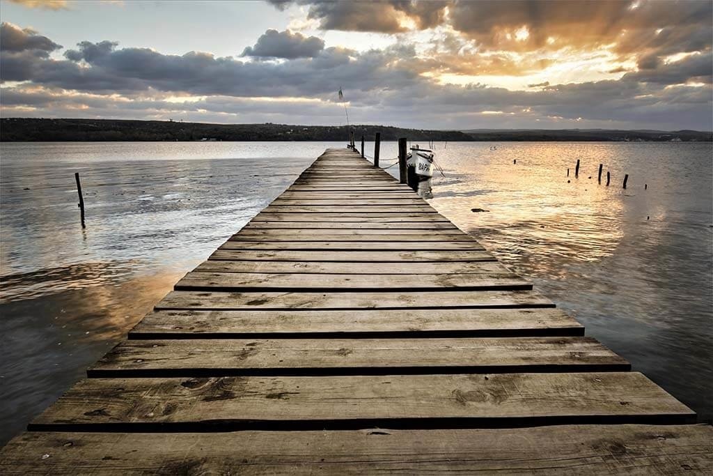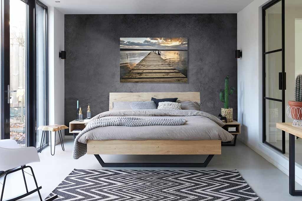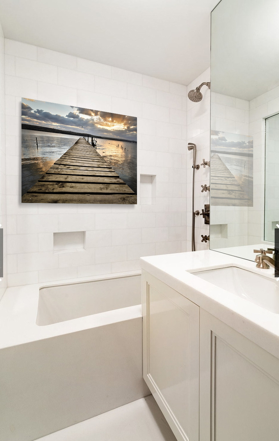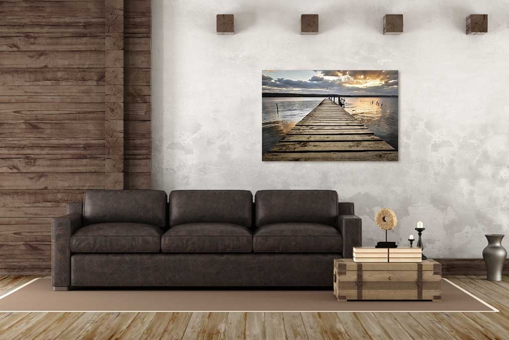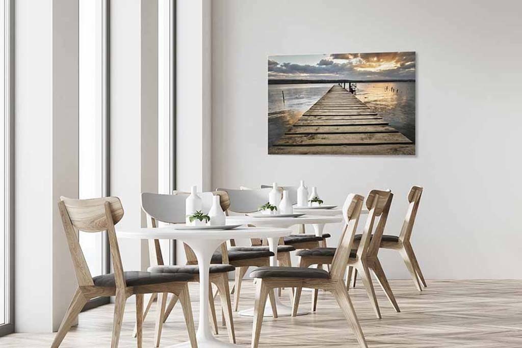 Bild eines hölzernen Stegs bei Sonnenuntergang. Durch die enorme Tiefenwirkung in der Fotokunst sieht es so aus, als würden Sie auf dem Steg laufen. Sieht schön aus über Ihrem Bett oder im Wohnzimmer über dem Sofa.