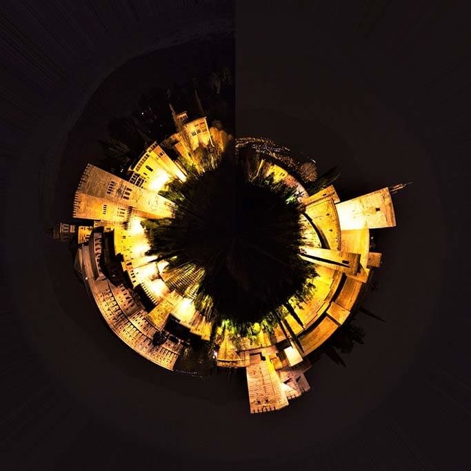 Ein interessantes 360-Grad-Bild einer Stadt. Mit einer speziellen Kamera wurde ein 360-Grad-Bild von Gebäuden, Stadtmauern und Türmen erstellt. Sehr geeignet für alle, die moderne Fototechniken lieben. Stellen Sie eine Serie zusammen, indem Sie weitere solche Bilder hinzufügen.