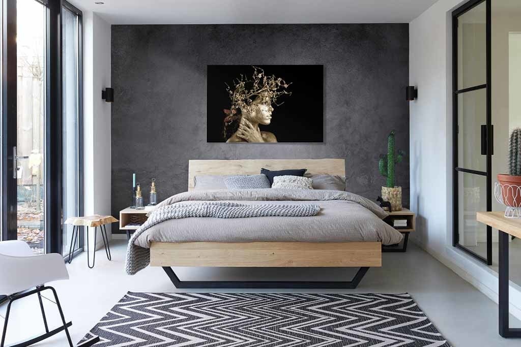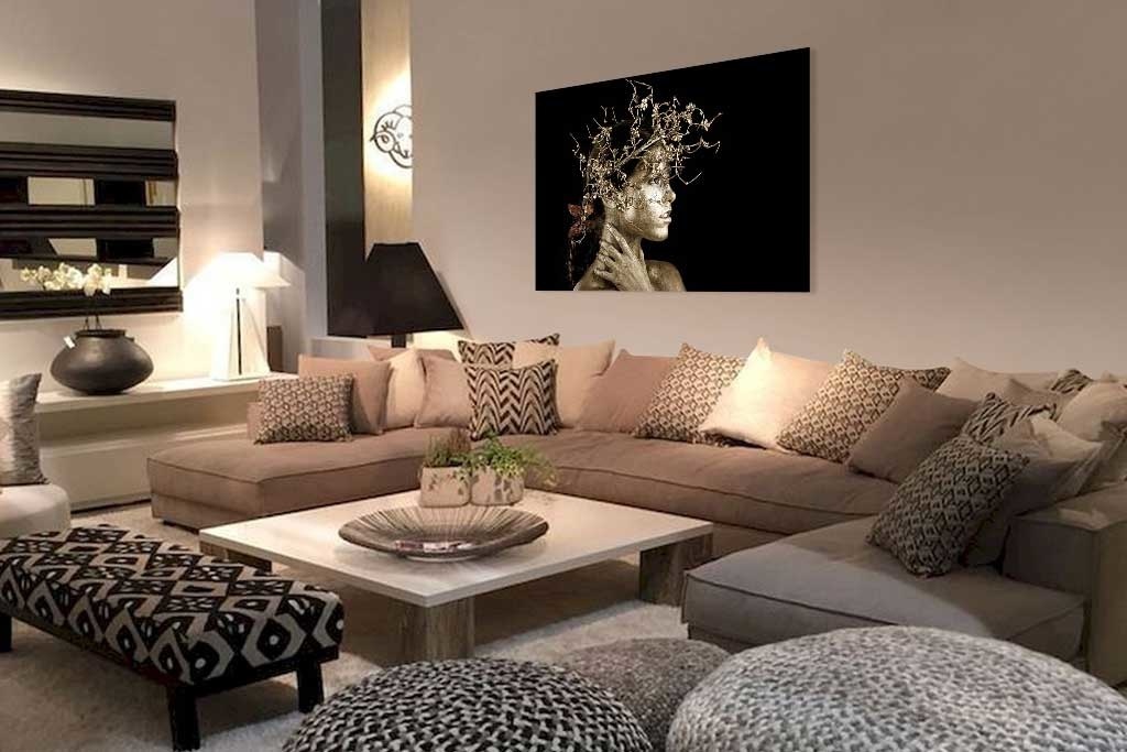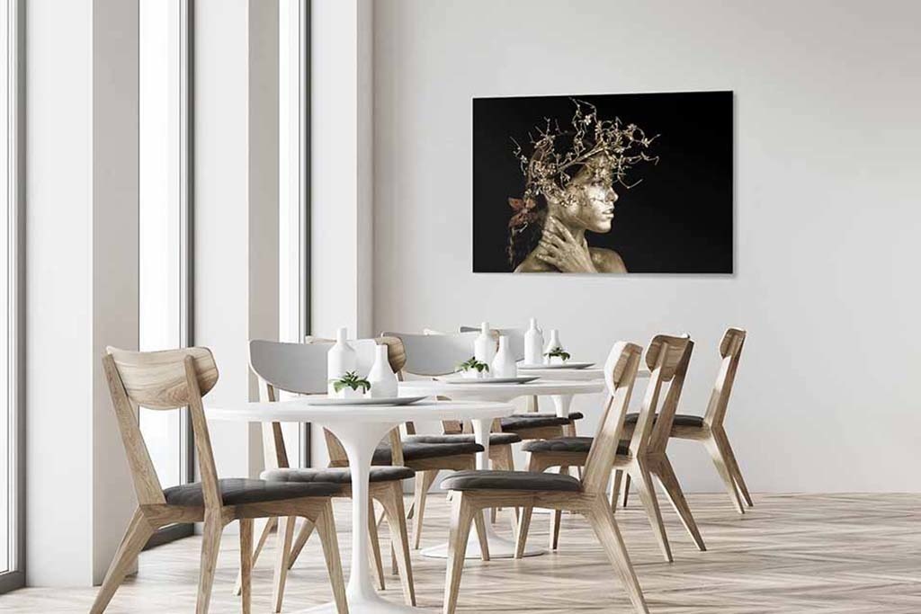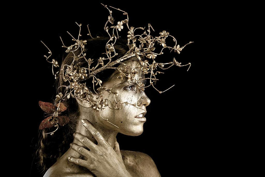 Besonderes Bild einer Art mythischen Person. Aufgrund der goldenen Farbe auf der Haut der Frau und des Blumenkranzes sieht sie aus wie eine Fee aus einem Märchen. Der schwarze Hintergrund macht das Bild noch eindrucksvoller. Passt in fast jedes Interieur und sieht in jedem Raum gut aus.