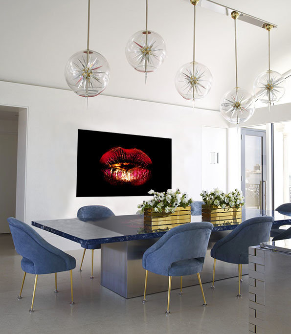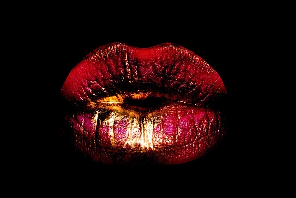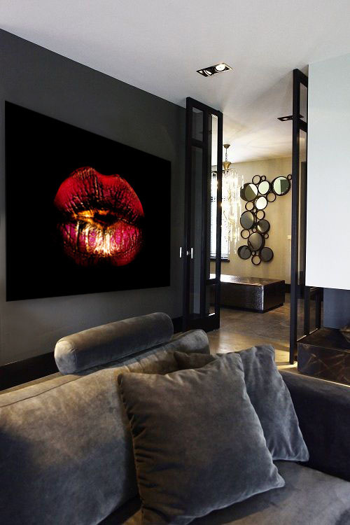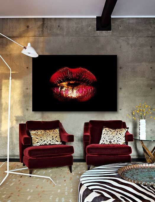Diese schönen vollen roten Lippen heben sich von der Wand ab, schön intensiv gefärbte Lippen auf schwarzem Hintergrund machen diese Kunst zu einem auffälligen Ganzen.