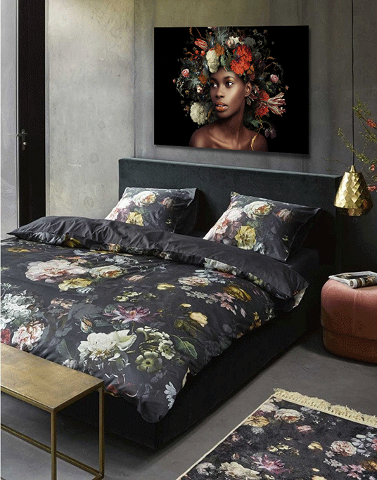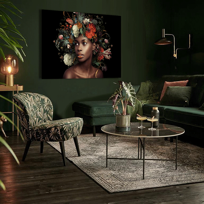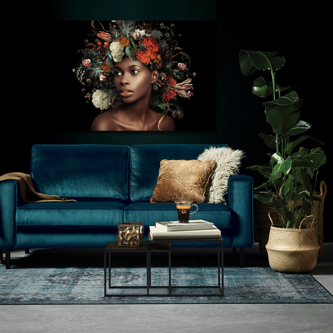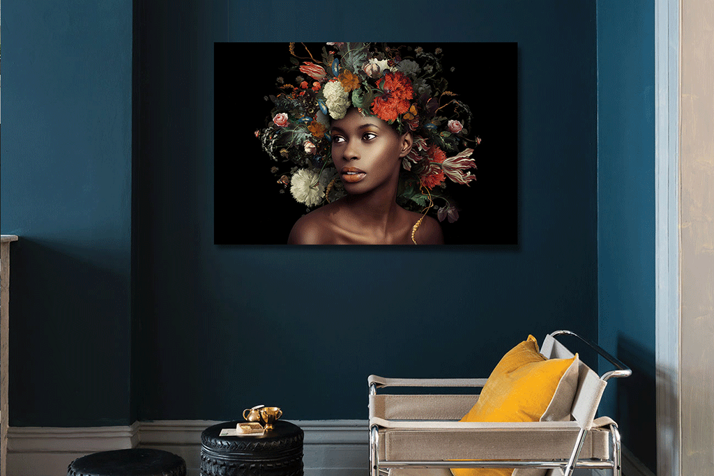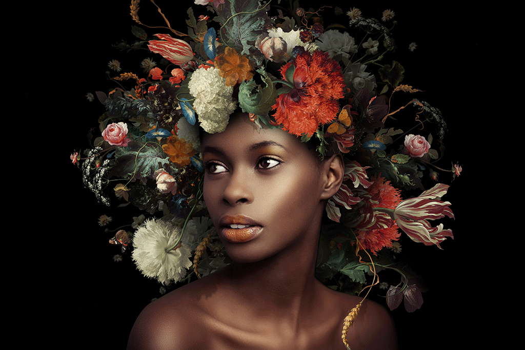 Prachtvolle Farben eines Stilllebens, gemalt von einem alten Künstler, hier dargestellt, als schöner Blumenschmuck auf dem Kopf einer schönen Frau. Sehr schön zu kombinieren mit einer anderen Kunst aus dieser Kollektion. Speziell für Xiart hergestellt, mit Echtheitszertifikat.