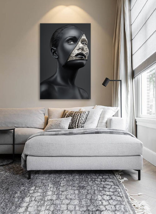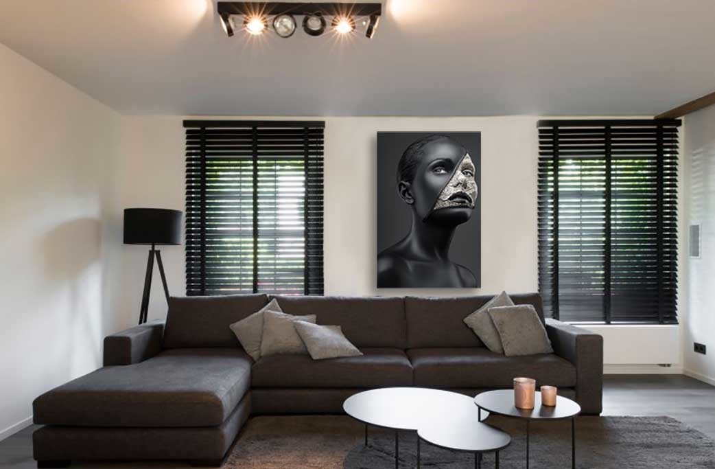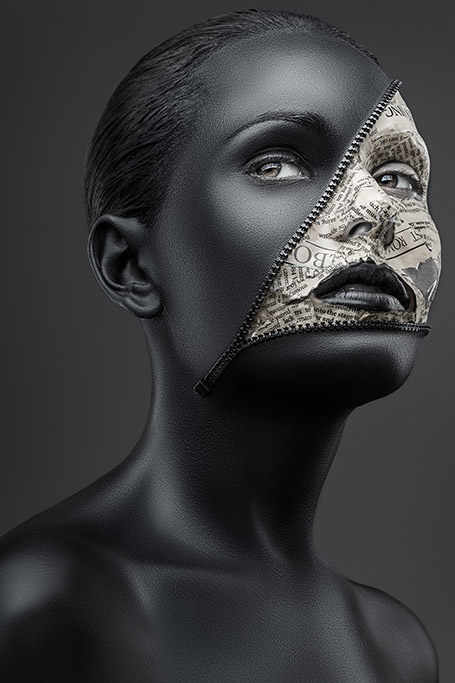 Eine schöne Fotokunst von einer Frau mit einer optischen Täuschung. Ihr Gesicht erscheint aufgerissen, wodurch die Illusion entsteht, dass ihr Gesicht aus Zeitungsausschnitten besteht. Dieses Fotokunstwerk wird Sie dank des naturgetreuen Make-ups und der aufregenden Farben in seinen Bann ziehen. Die Frau ist ganz in Schwarz gemalt, so dass sie schön mit dem Hintergrund verschmilzt. Hervorragend geeignet für ein Art-Deco-, trendiges und modernes Interieur. Aber auch in einem klassischen Interieur kommt diese Fotokunst gut zur Geltung.