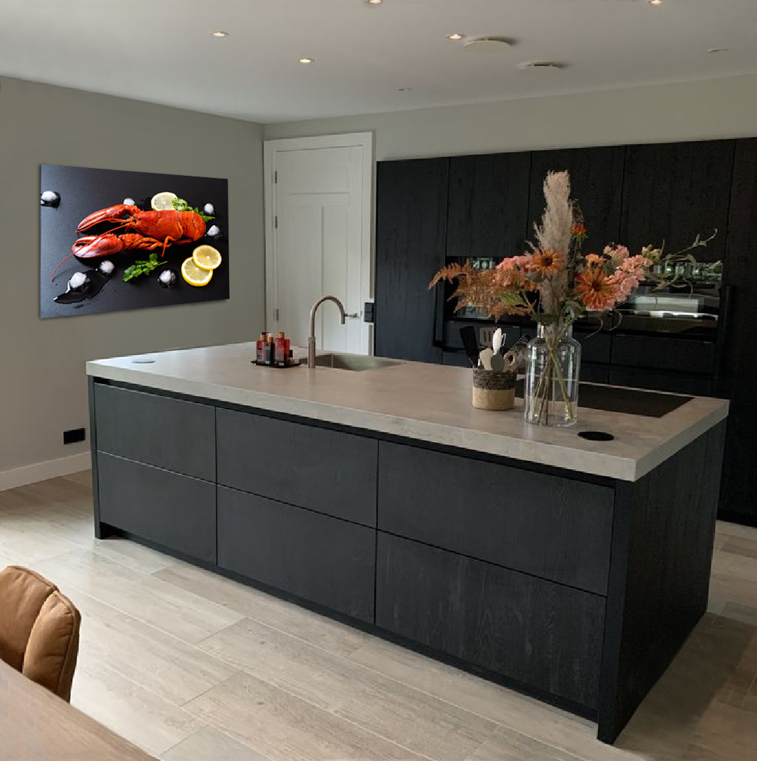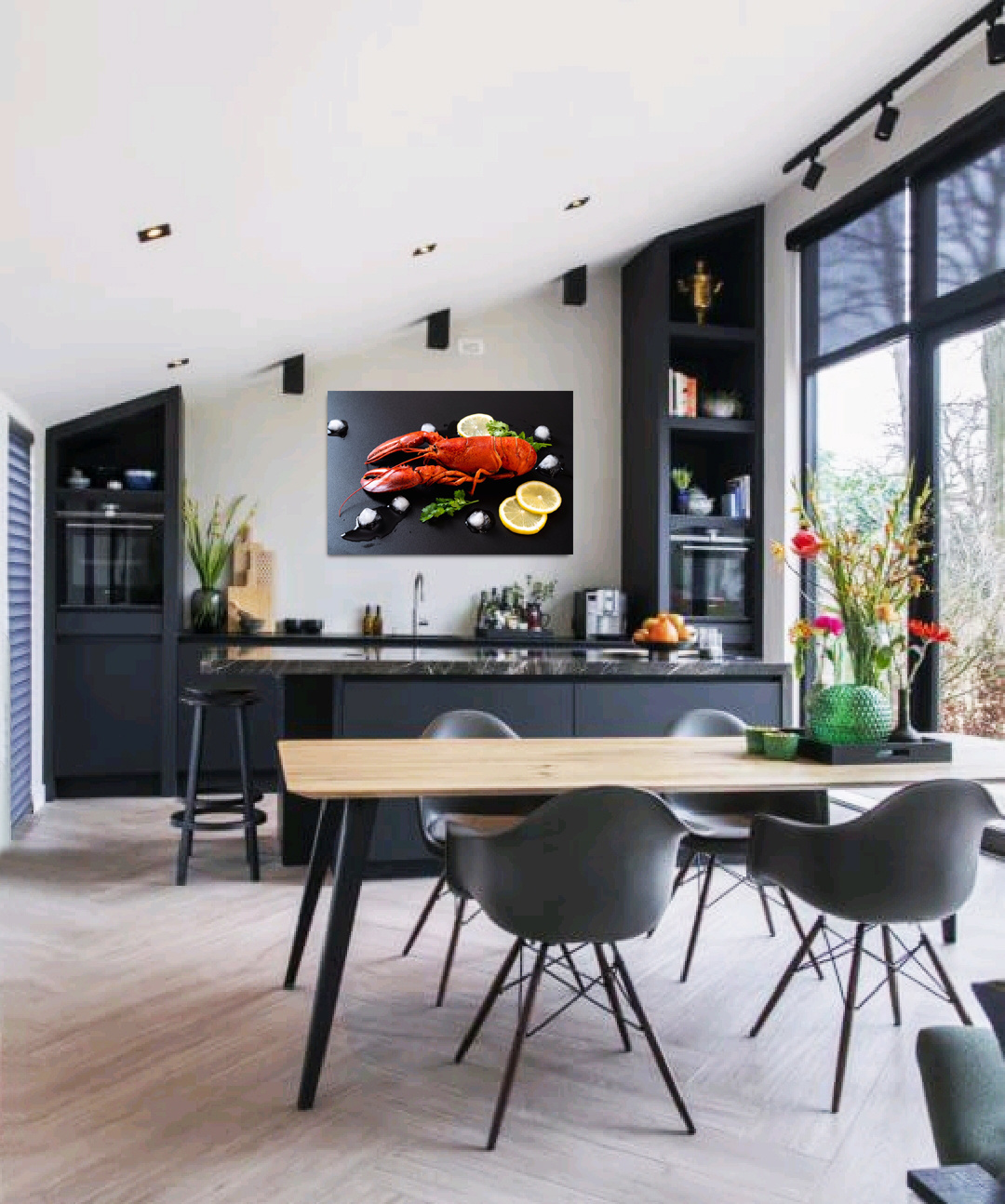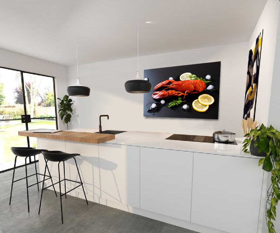 Eine gewagte Fotokunst für alle, die diese Delikatesse zu schätzen wissen oder den Hummer als schönes Tier empfinden. Hängen Sie diese Kunst in der Küche auf und fühlen Sie sich jeden Tag wie in einem Restaurant. Die leuchtenden Farben heben sich schön von einem dunklen Hintergrund ab und bieten einen spannenden Kontrast. Seafood Dining' ist nicht nur eine Bereicherung in der Küche, sondern auch sehr gut geeignet in einem Restaurant, einer Bar oder einem Geschäft.