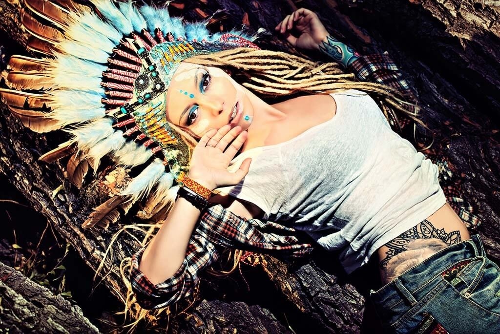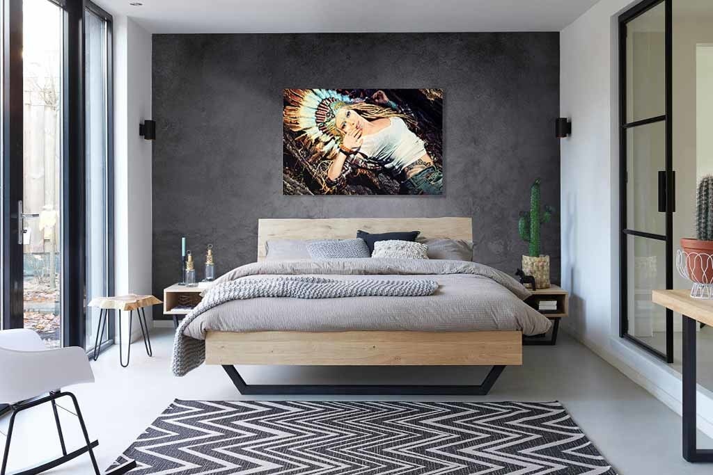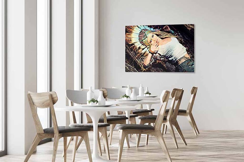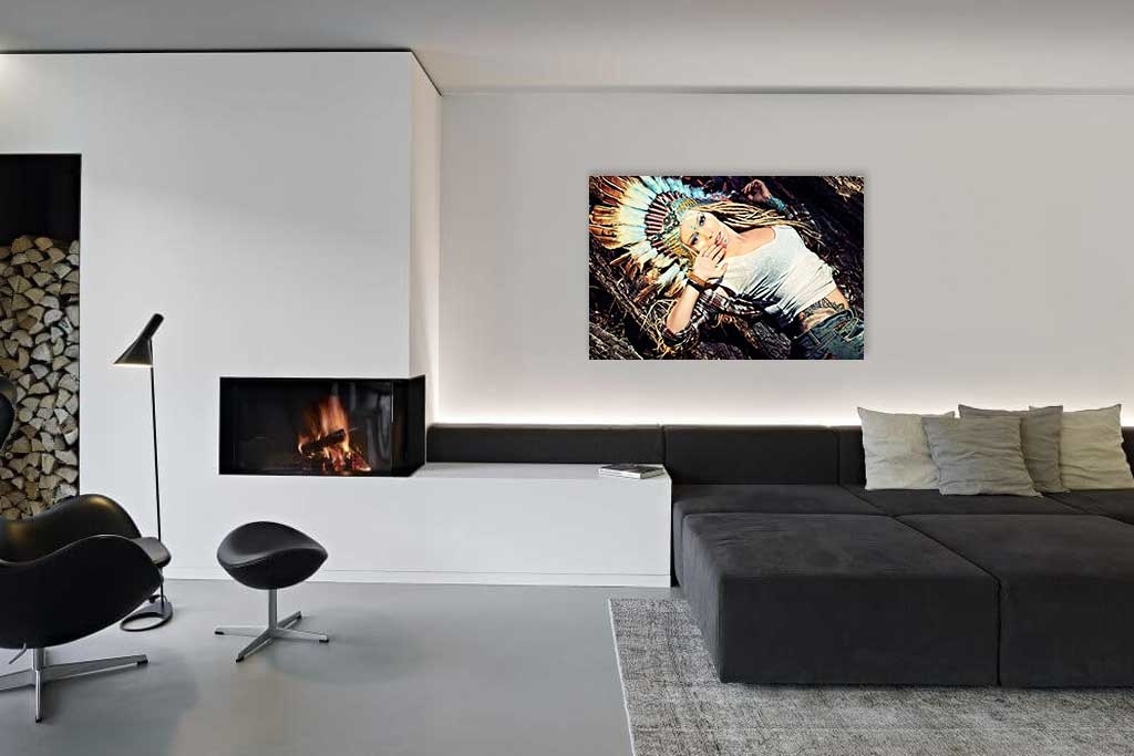 Bunte Darstellung einer Frau mit Indianerschmuck. Die Frau liegt sexy auf einer Art Baumstamm. Auf ihrer Hüfte befindet sich eine große Tätowierung. Kombinieren Sie mit anderen aufregenden Bildern von Frauen und kreieren Sie Ihre eigene Serie. Sieht gut aus, zum Beispiel im Wohnzimmer oder im Schlafzimmer.