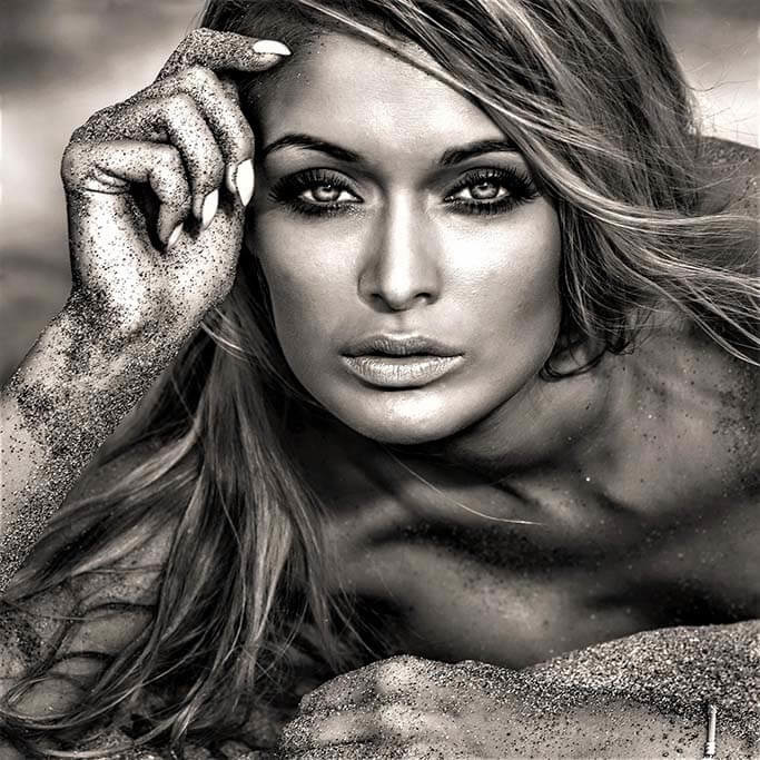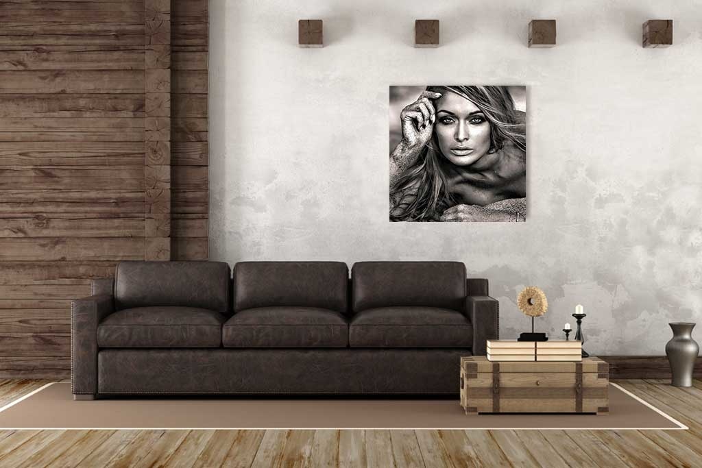 Sexy Frau am Strand, schöne Kunst einer sinnlichen Frau die im Sand liegt, schöne Komposition und Farben, die quadratische Form gibt es einen modernen Look. Gut zu kombinieren mit mehreren Bildern.