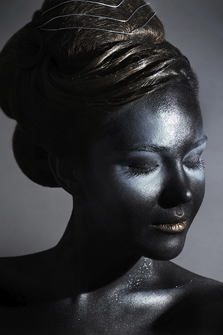 Großartiges, ruhiges, aber besonders schönes, markantes Bild einer Frau. Schönes Licht auf ihr Gesicht, die volle bronzenen Lippen passen gut zu ihrer Haarfarbe. Die Grau-Braun-Töne passen sehr gut zusammen und machen das Ganze zu etwas Besonderem.