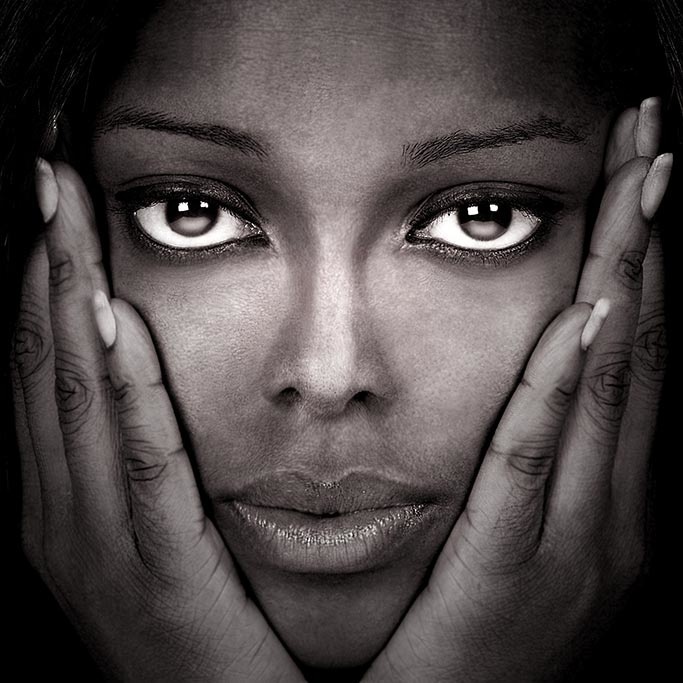 Schöne Fotokunst einer Frau Gesicht mit schönen Augen hält ihre Hände gegen ihr Gesicht. Sehr schöne Kontraste, das Licht auf ihrem Gesicht gibt einen schönen Effekt.