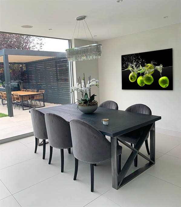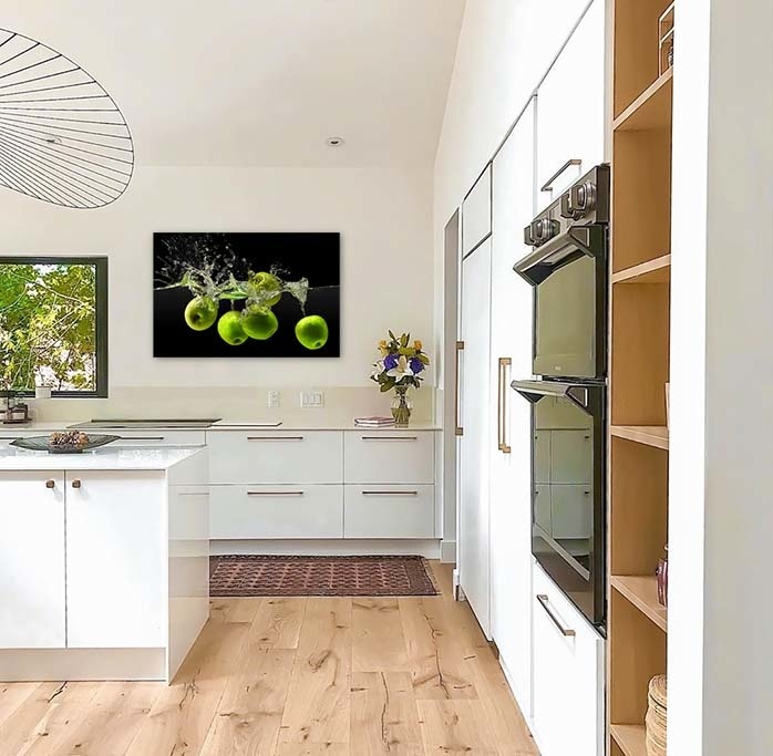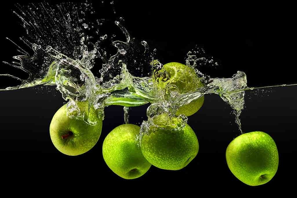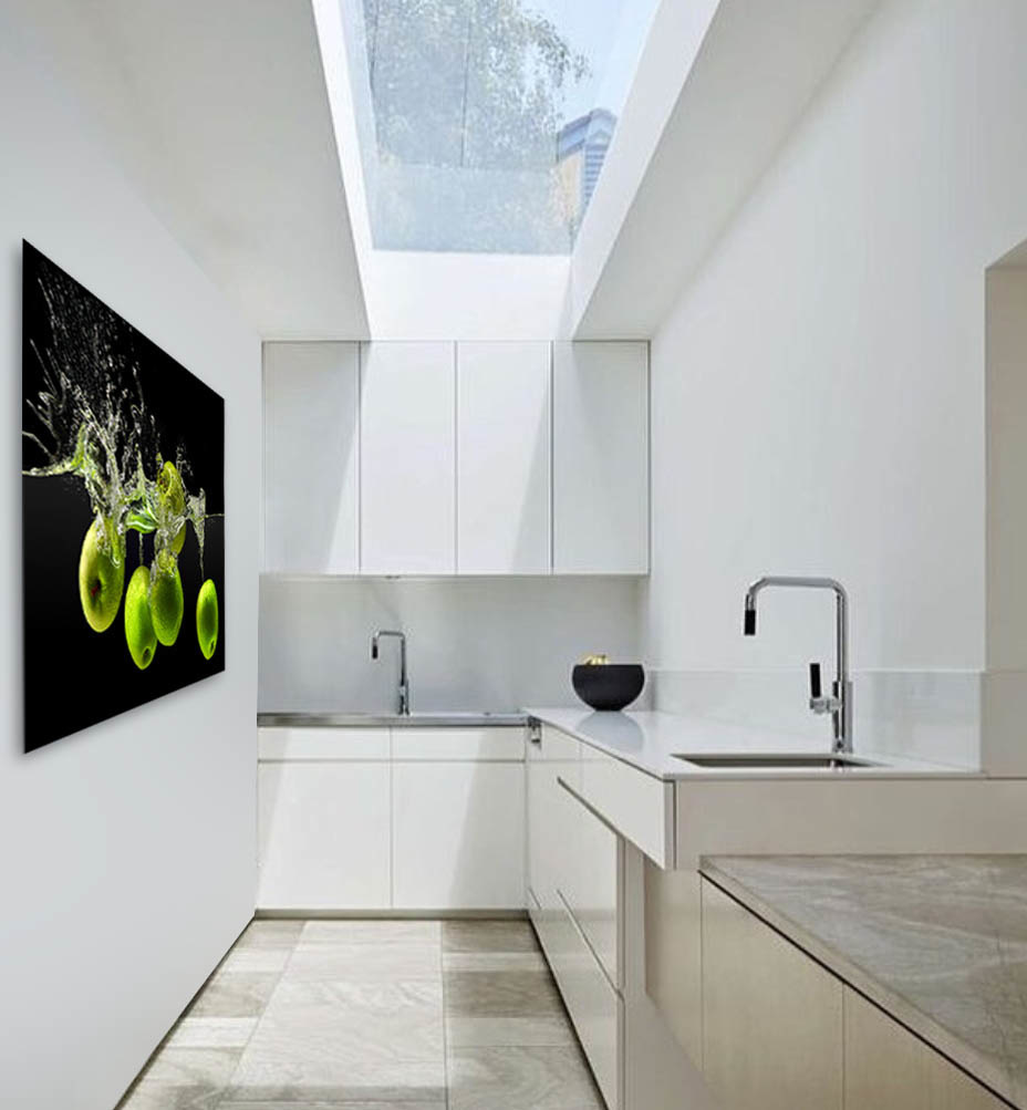 Nettes Bild von grünen frischen Äpfeln in spritzendem Wasser, vor einem schönen kontrastierenden dunklen Hintergrund. Sehen Sie sich auch unsere weitere Kollektion an Kunst mit Obst an.