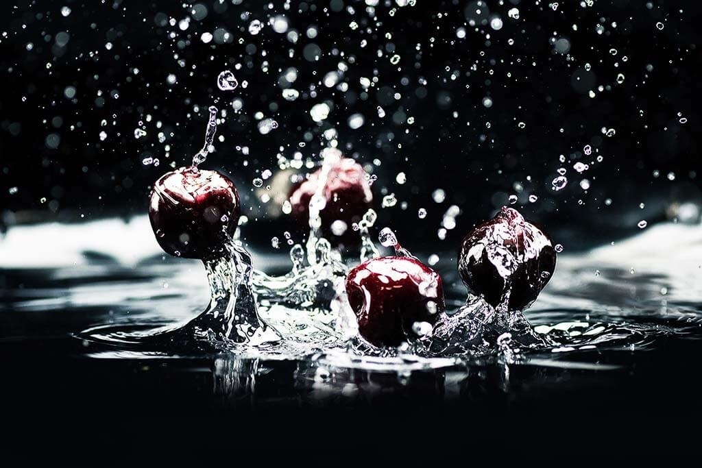 Obst, das im Wasser aufspritzt, hängen Sie ein paar zusammen und es bildet ein kunstvolles Ganzes, sehr schön für die Küche.