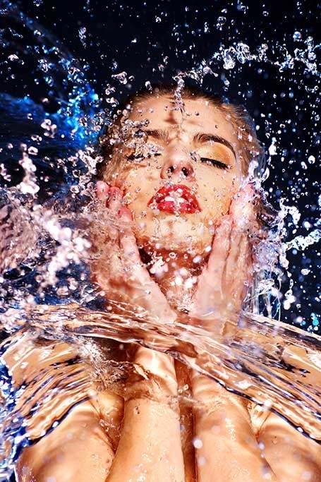 Nahaufnahme einer Frau, die Wasser in ihr Gesicht bekommt. Das aufspritzende Wasser gibt dieser Fotokunst etwas Besonderes.