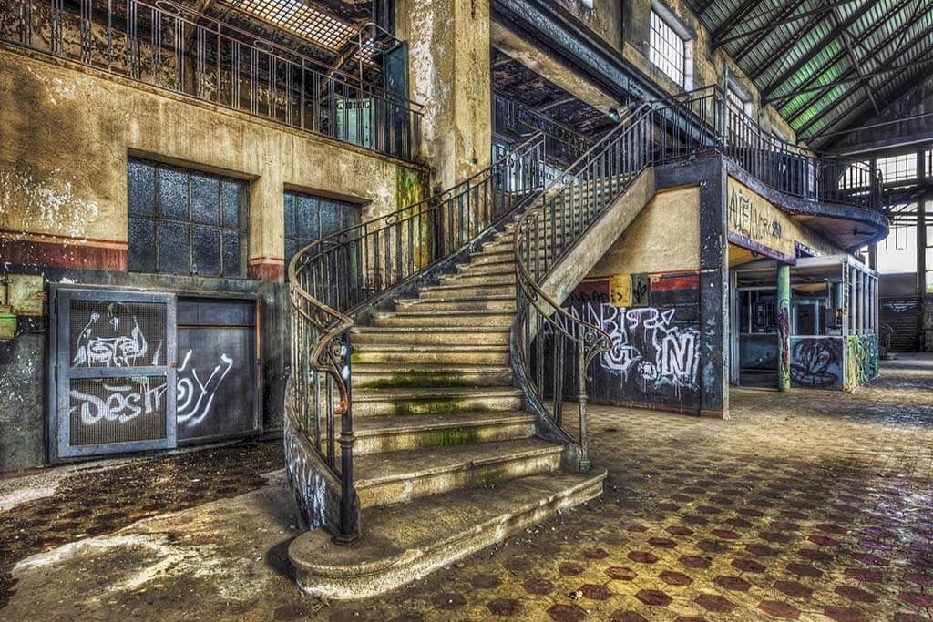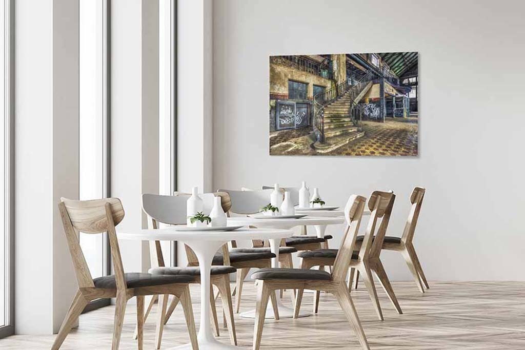 Obwohl dieses Anwesen alt und verlassen ist, können Sie immer noch sehen, wie schön es einmal war. Die große Treppe mit Balustrade hat immer noch etwas Beeindruckendes. Sehr geeignet für Fans der urbanen Fotografie. Schön zu kombinieren mit anderen Bildern von verlassenen Immobilien. Passt in viele Innenräume.