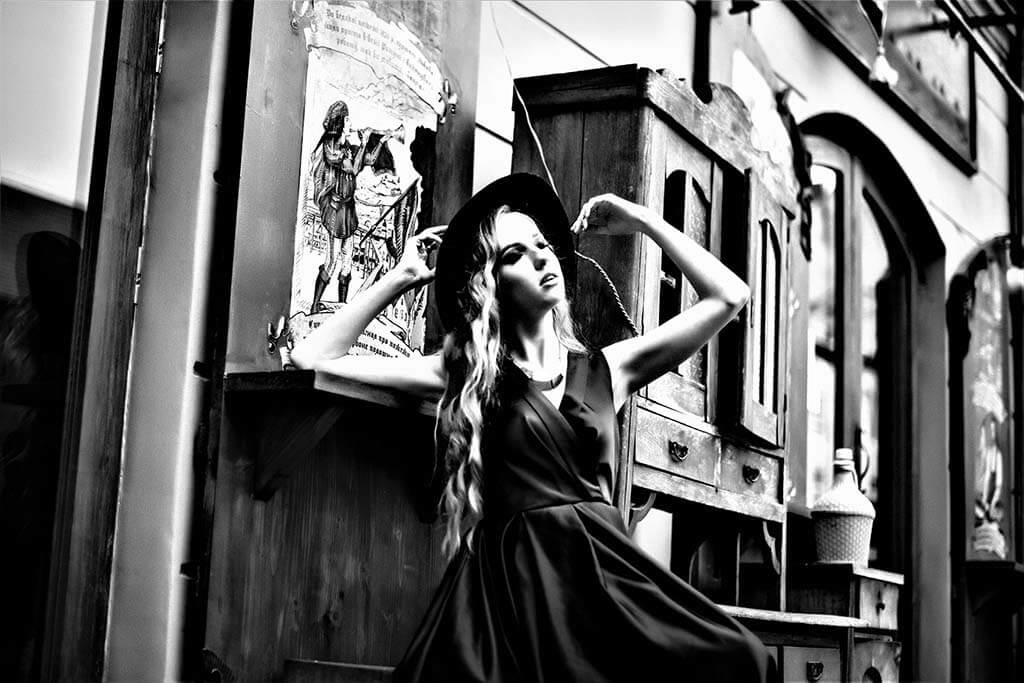 Vintage-Bild in Schwarz-Weiß von einer jungen Frau, die durch die Straße tanzt.