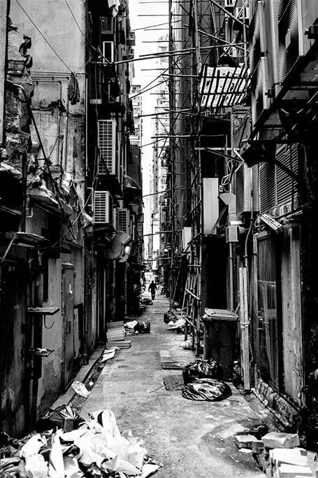 Schwarz-Weiß-Bild einer Straße in einer großen Stadt. Das Bild zeigt eine Menge und es wird schnell klar, dass die Straße nicht gut gepflegt ist. Dies macht das Bild interessant zu betrachten. Schön zu kombinieren mit anderen Stadtbildern.