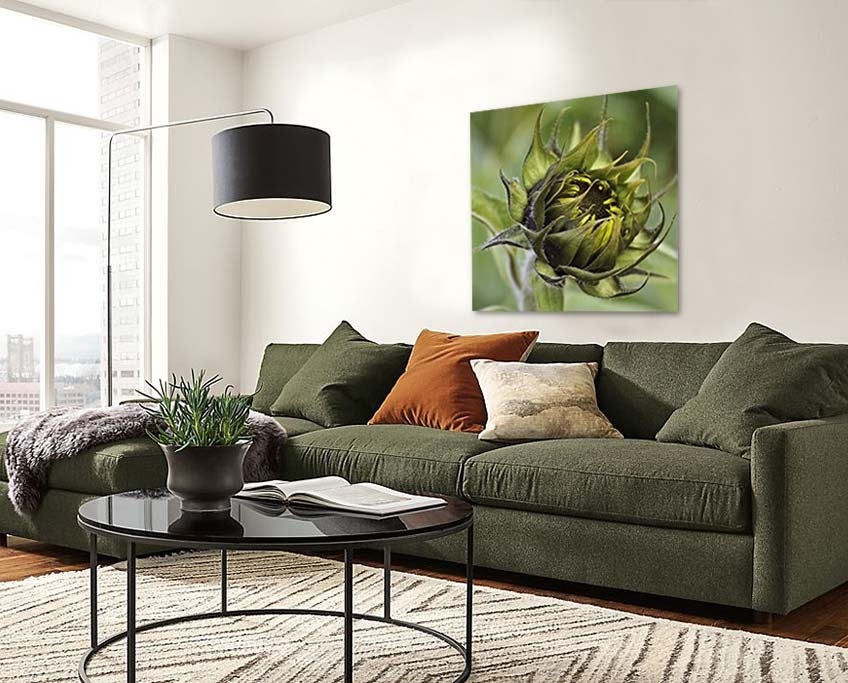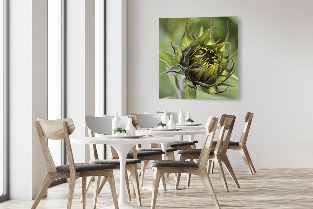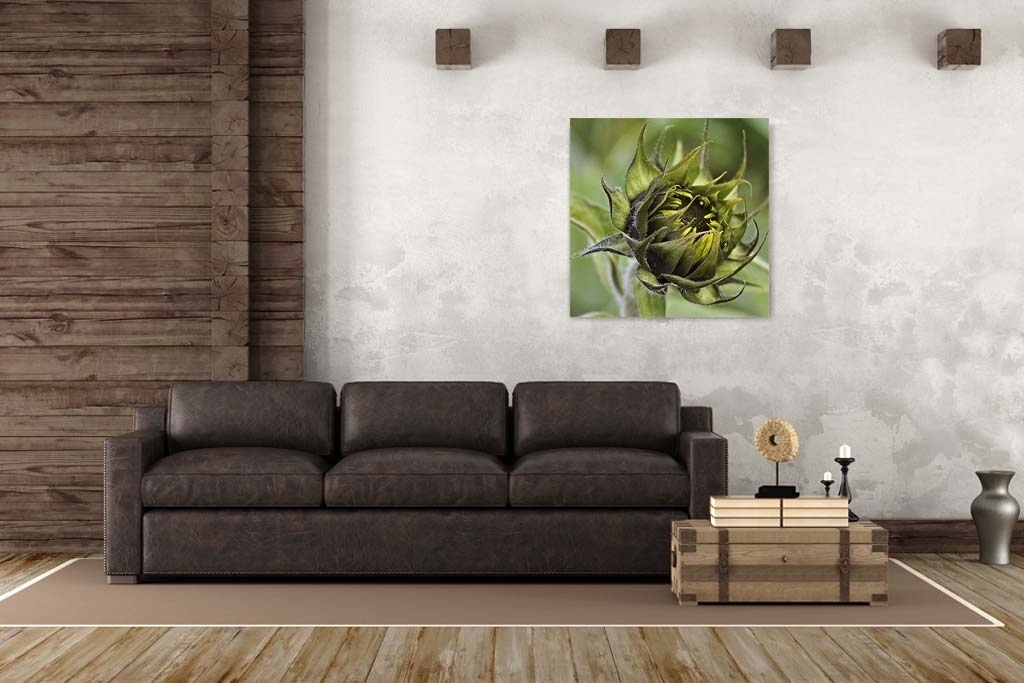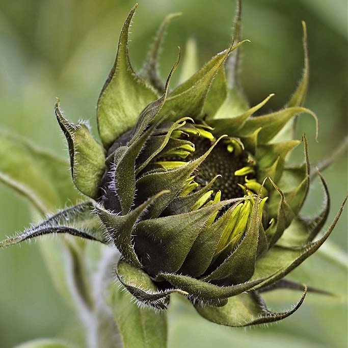 Nahaufnahme einer Sonnenblume noch nicht in der Blüte, schöne grüne Farbe, quadratisch, modernes Stück der Natur.