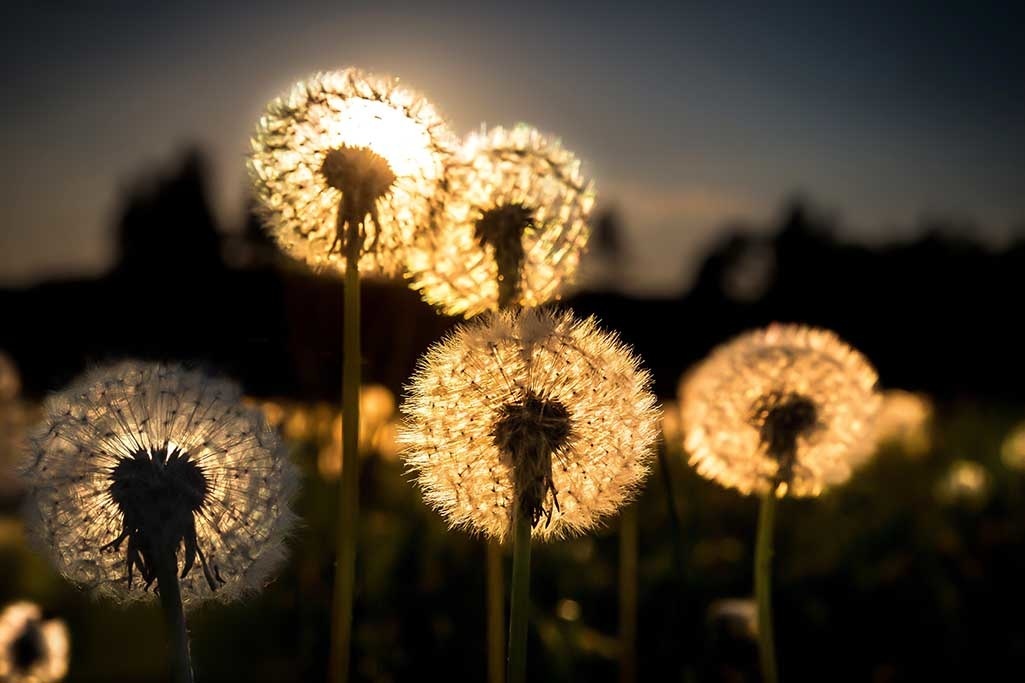 Eine Gruppe verblühter Löwenzahn vor einem Sonnenuntergangshintergrund, der den Anschein erweckt, als würden die Blumen leuchten.