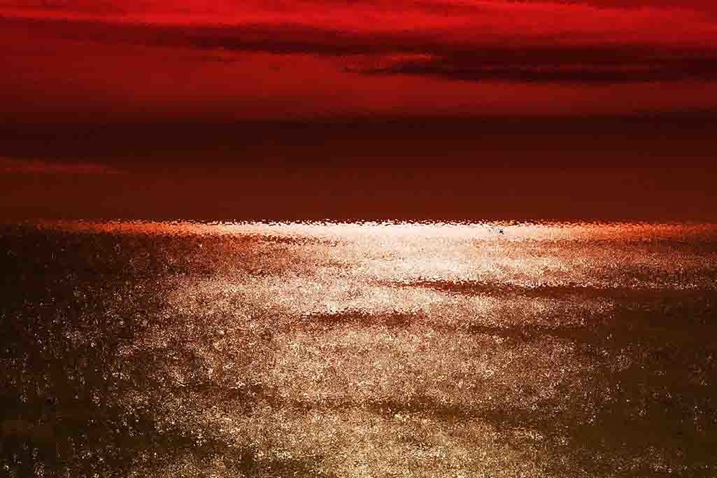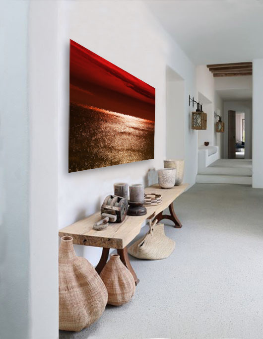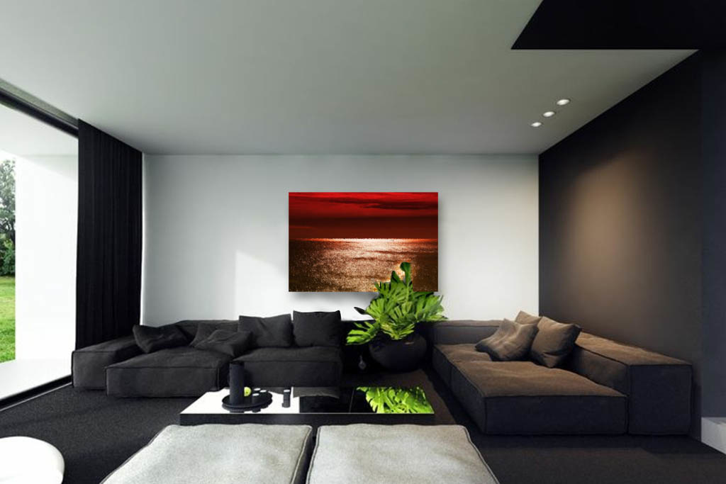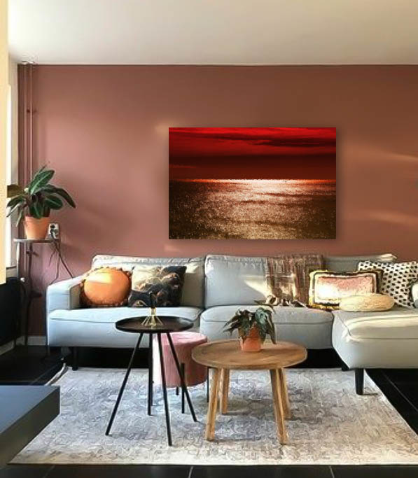 Ein schönes abstraktes Kunstwerk eines Sonnenuntergangs. Der Himmel leuchtet auffallend rot und das Meer scheint voller goldener Funken zu sein. Ein Sonnenuntergang hat immer etwas Magisches, man kann ihn stundenlang beobachten. Mit dieser Fotokunst können Sie Wärme, Ruhe und Harmonie in Ihrem Raum schaffen. Ideal für Wohnzimmer, Flur, Büro oder Schlafzimmer. Abstrakte Kunst ist offen für eine Vielzahl von Interpretationen. Daher ist es wichtig, dass das Kunstwerk Gefühle und Emotionen hervorruft. Die warme Farbpalette macht diese Fotokunst zu einer stilvollen Ergänzung für jedes Interieur.