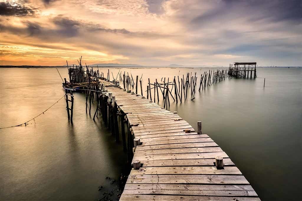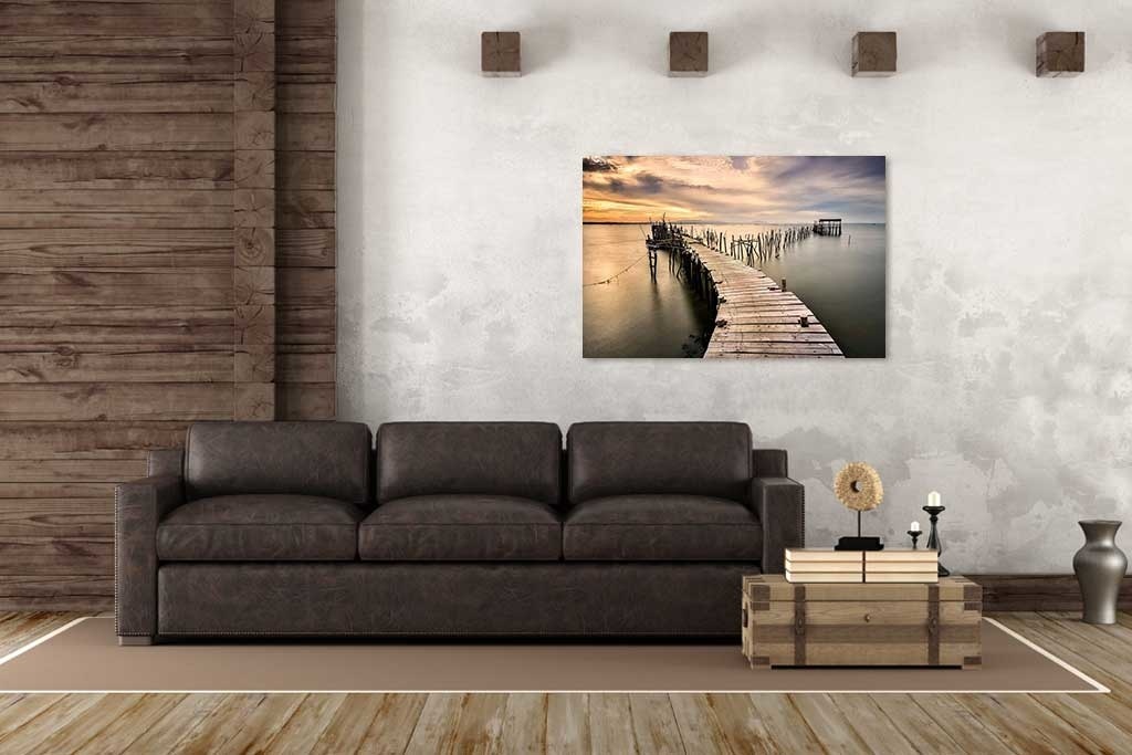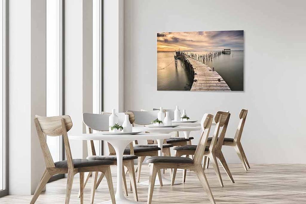 Stimmungsvolles Bild von einer Art Steg im Wasser bei Sonnenuntergang. Die Farben des grauen Wassers und des orangefarbenen und violetten Himmels passen perfekt zusammen. Die Komposition im Foto vervollständigt das Bild. Passt sehr gut in das Schlafzimmer. Passt zu jedem Interieur.