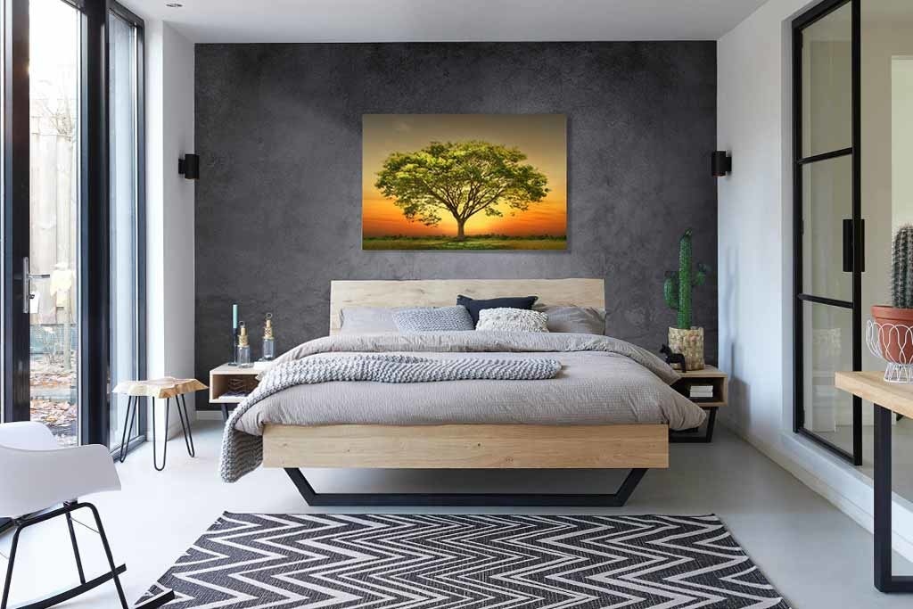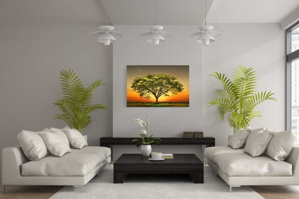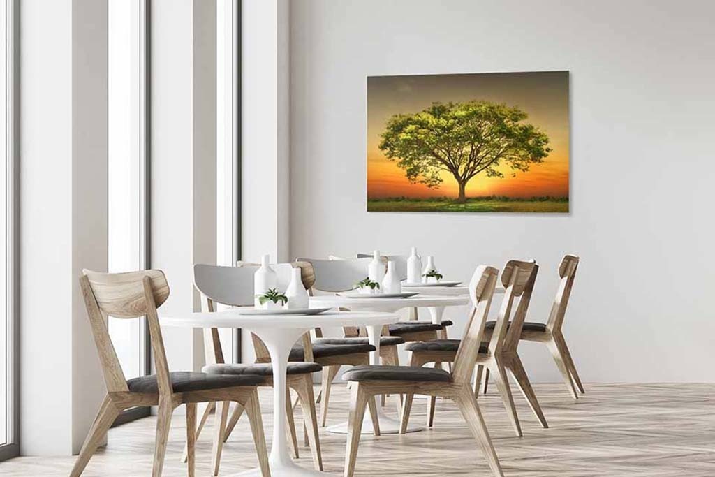 Buntes Foto eines Baumes bei Sonnenuntergang. Die untergehende Sonne verleiht dem Himmel schöne gelbe und orange Farben. Das leuchtende Grün des Baumes kommt hier gut zur Geltung. Das Bild sieht in jedem Raum des Hauses gut aus. Kann mit anderen Naturfotos kombiniert werden.