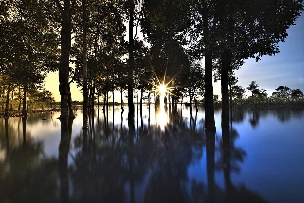 Als ob Dali es gemalt, schöne Reflexion der Bäume im Wasser bei Sonnenuntergang. Die tiefstehende Sonne unter den dunklen Bäumen gibt dem Ganzen einen tollen Kontrast.