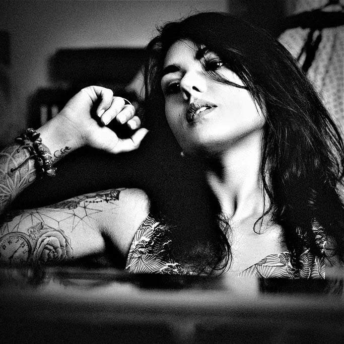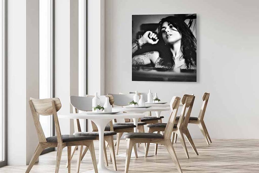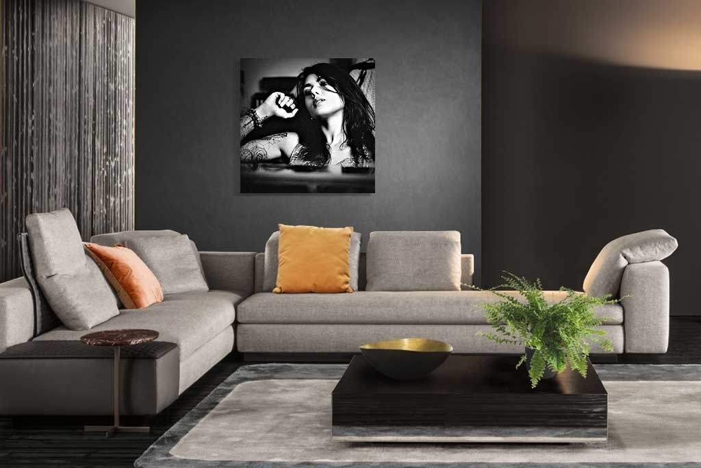Schwarz-Weiß-Bild einer Frau mit Tattoos. Die Frau hat dunkles langes Haar und mehrere Tattoos auf dem Arm. Der Schwarz-Weiß-Effekt macht das Foto sehr stilvoll. Schön zu kombinieren mit anderen Porträts. Sieht gut aus, z. B. im Wohnzimmer, Schlafzimmer oder Arbeitsbereich.