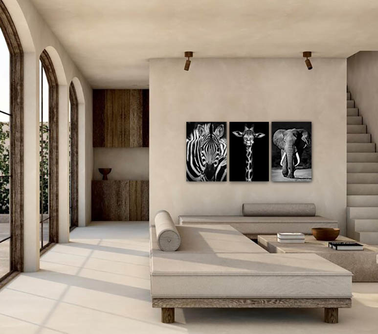 Schönes dreiteiliges Bild von drei Wildtieren in schwarz-weiß in der Größe 60x40cm Dibond. Sieht in fast jedem Interieur schön und cool aus.