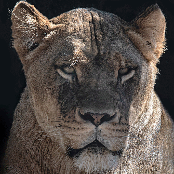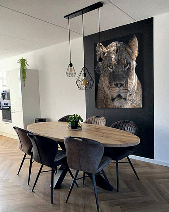 Eine beeindruckende Fotokunst von einer Löwin mit sandgelbem Fell. Die schönen goldenen Augen verleihen dem Tier ein charmantes Aussehen. Die Sonne auf dem Fell lässt es aufleuchten und der Schatteneffekt verleiht der Fotokunst einen geheimnisvollen Touch. Diese Löwenkönigin steht für Stärke und Schutz und passt in jeden Raum, in dem dies gewünscht ist. Aber auch, wenn Sie einfach ein einzigartiges Kunstwerk aufhängen möchten, um einem Raum mehr Flair zu verleihen.