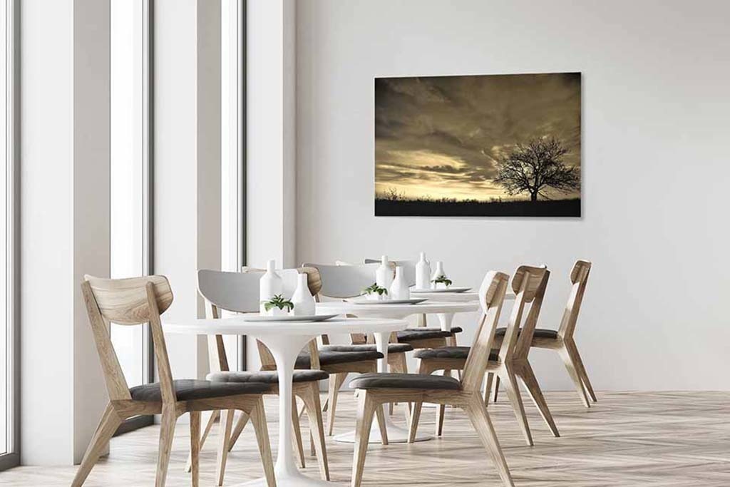 Spezielles Bild eines einsamen Baumes mit einer hellen Sonne im Hintergrund. Es ist nicht sofort klar, was man da sieht, aber das macht das Bild interessant. Geeignet für alle, die beeindruckende Fotografie lieben. Sieht sowohl im Schlafzimmer als auch im Wohnzimmer gut aus.