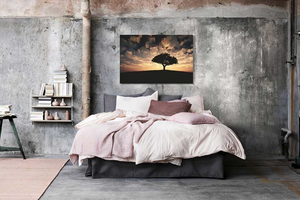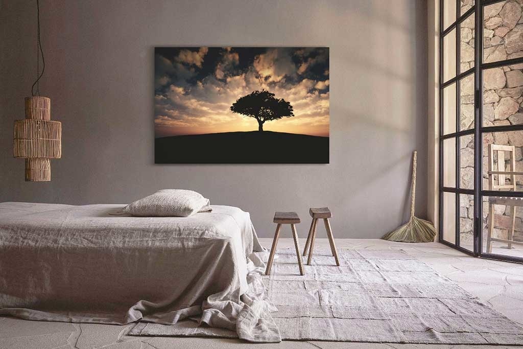 Das Abendrot mit fantastisch kontrastierenden Wolken, gegen die sich ein kunstvoller Baum im Vordergrund abhebt. Wunderschönes Farbspiel der Natur, das man sich immer wieder ansehen kann. Auch in quadratischer Ausführung erhältlich. Sieht schön aus in einem warmen Interieur, aber auch schön als Kontrast an einer hellen Wand.