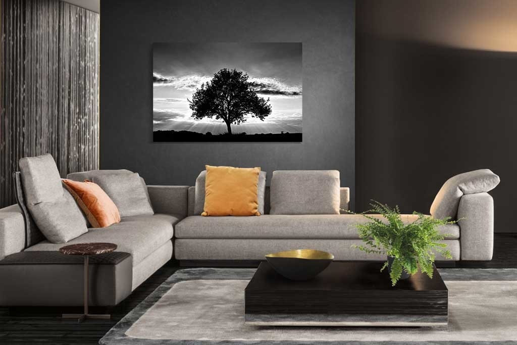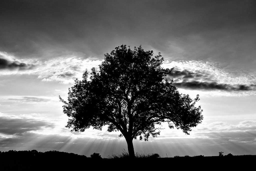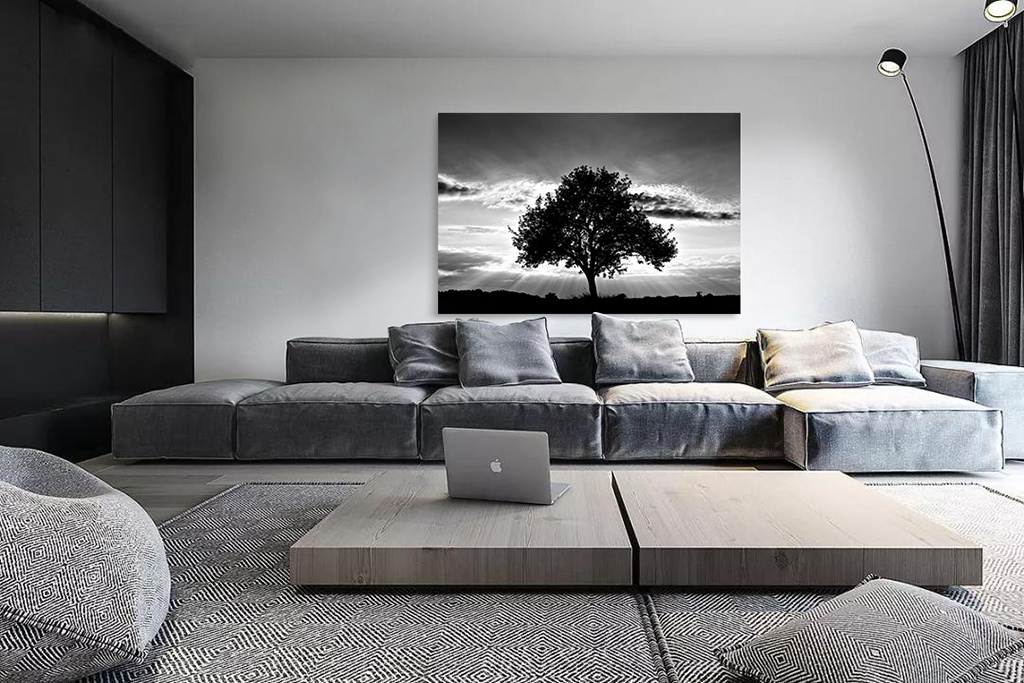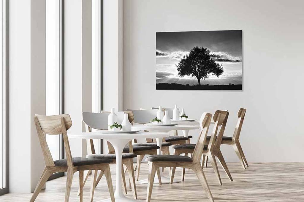 Ungewöhnliches Schwarz-Weiß-Foto eines freistehenden Baumes. Der Baum steht vor der Sonne, so dass die Sonnenstrahlen genau entlang des Baumes fallen. Geeignet für alle, die sich mehr natürliche Schönheit in ihrem Zuhause wünschen. Schwarz-Weiß-Fotos passen in fast jede Einrichtung. Gut zu kombinieren mit anderen Bildern der Natur.