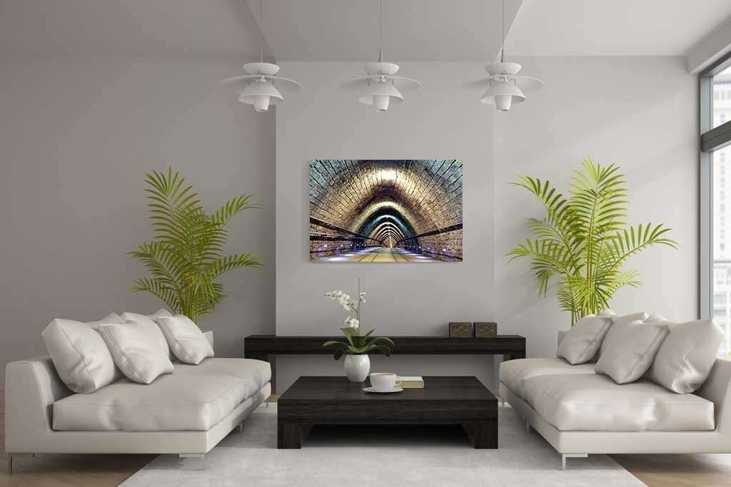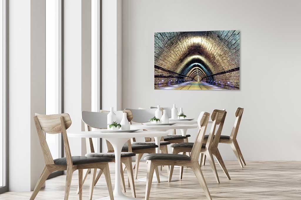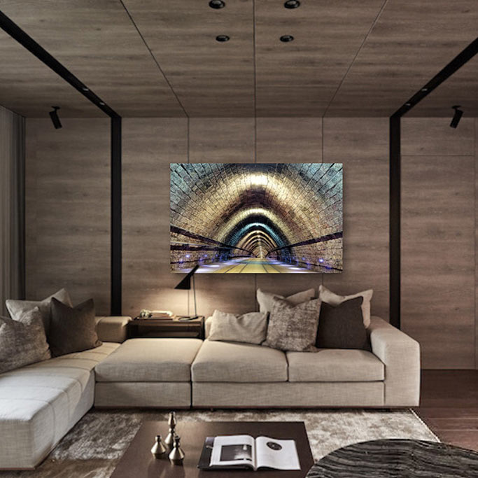 Fotokunst einer U-Bahn, der Lichteinfall und die schönen Farben machen diese abstrakte Kunst zu einem besonderen Bild, das in vielen Innenräumen sehr schön aussehen wird.