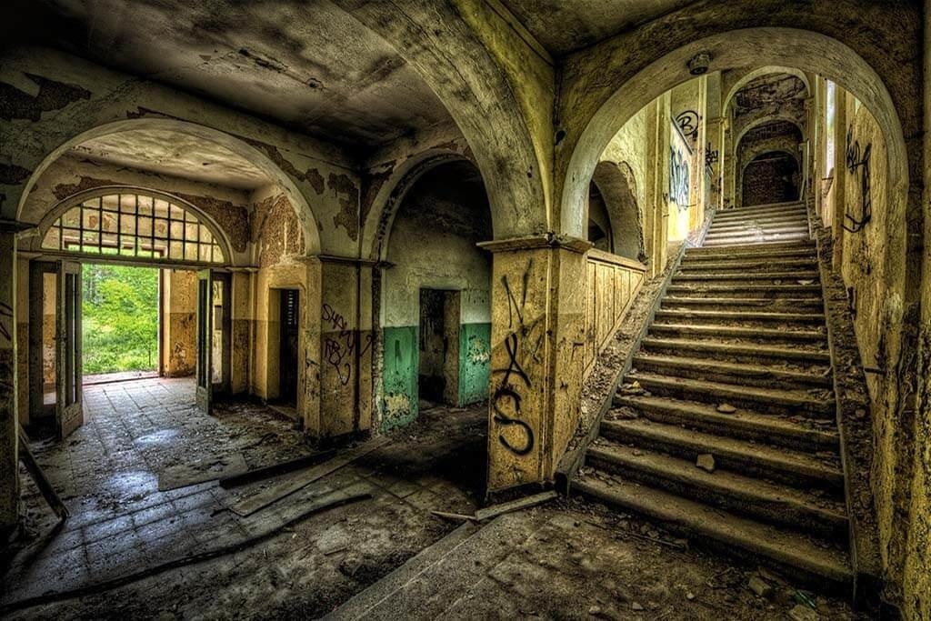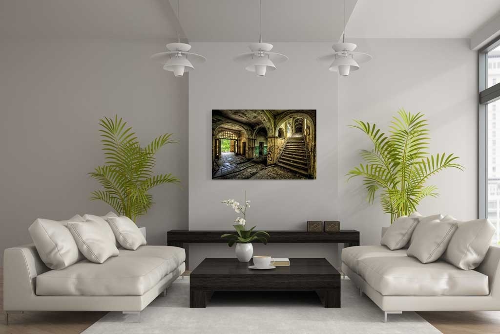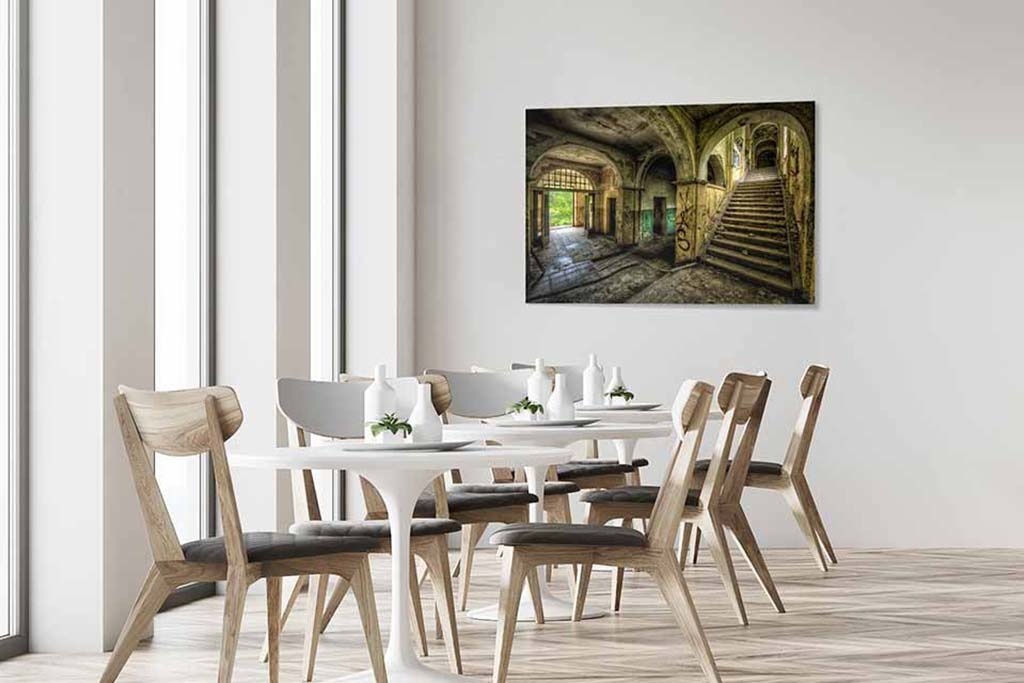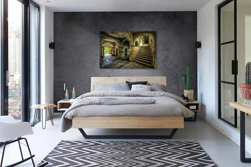 Spezielles Bild eines verlassenen Gebäudes in der Stadt. Durch die grauen Farben und Graffiti an den Wänden strahlt das Bild etwas Besonderes aus. Wirklich etwas für Fotografie-Liebhaber also. Schön zu kombinieren mit anderen Urban-Art-Bildern. Sieht gut aus, z. B. im Wohn- oder Arbeitsbereich.