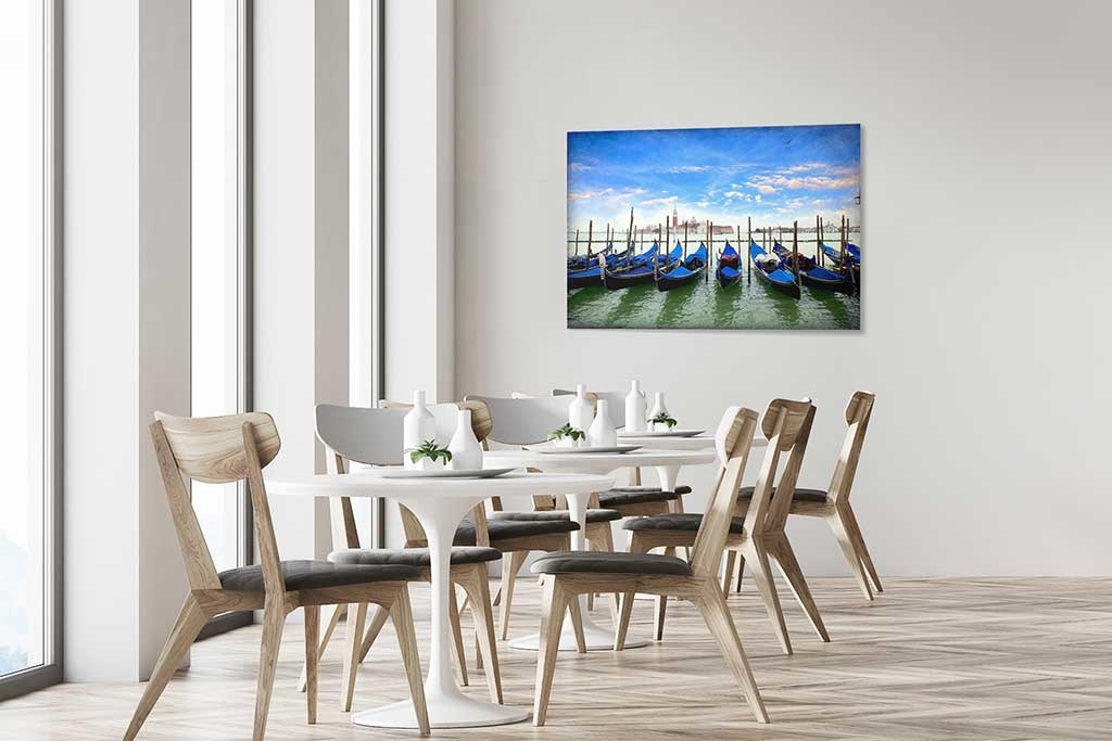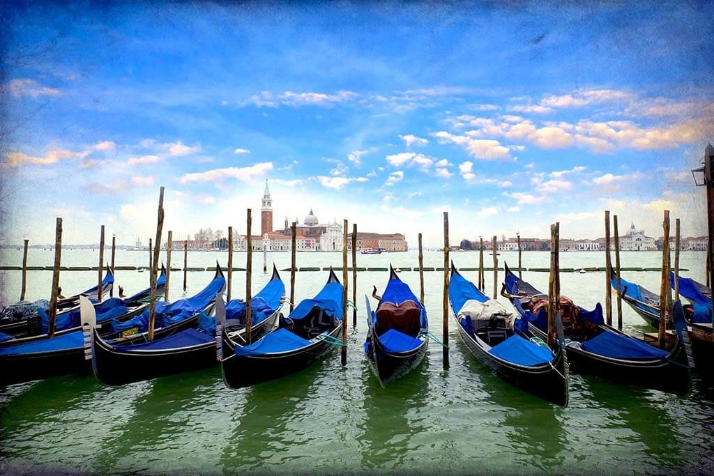 Schönes Bild von venezianischen Gondeln in der schönen Farbe Blau, schön im Kontrast mit dem blauen Himmel.