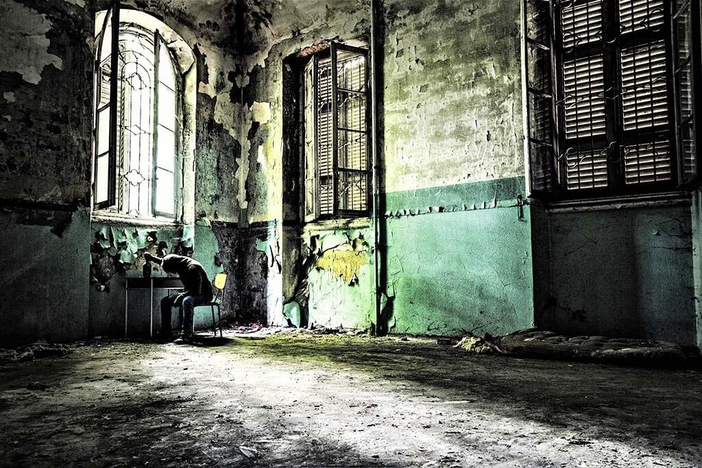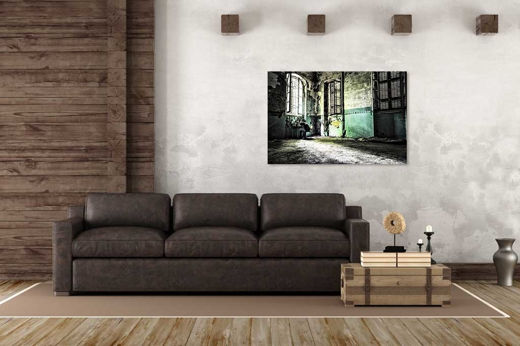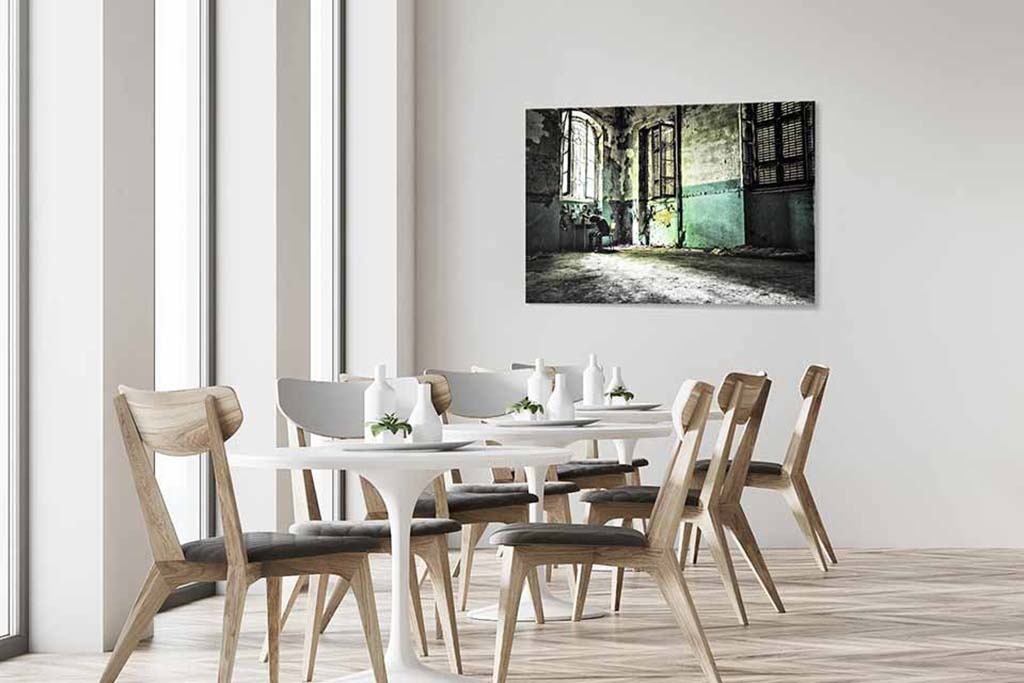 In diesem Bild blättert Farbe von der Wand eines verlassenen Gebäudes ab. Es gibt auch eine einsame Person, die an einem Tisch sitzt. Genügend Elemente, um das Bild interessant zu gestalten. Schön zu kombinieren mit anderen Urban-Art-Bildern. Sieht in allen Räumen des Hauses gut aus.
