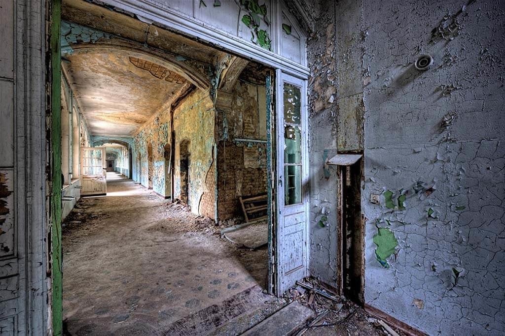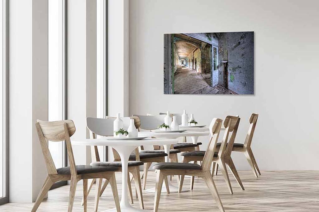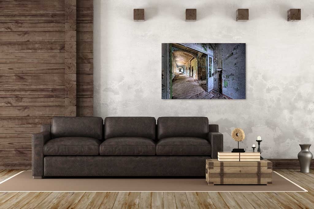 Ein verlassener Korridor, in dem die Farbe von der Wand abblättert. Dieses Bild ist wegen seiner schönen Farben, des Lichts und der Tiefenwirkung etwas ganz Besonderes. Sieht gut aus im Wohnzimmer, Schlafzimmer und Arbeitsbereich. Schön zu kombinieren mit anderen Urban-Art-Bildern. Passt in jeden Innenraum.