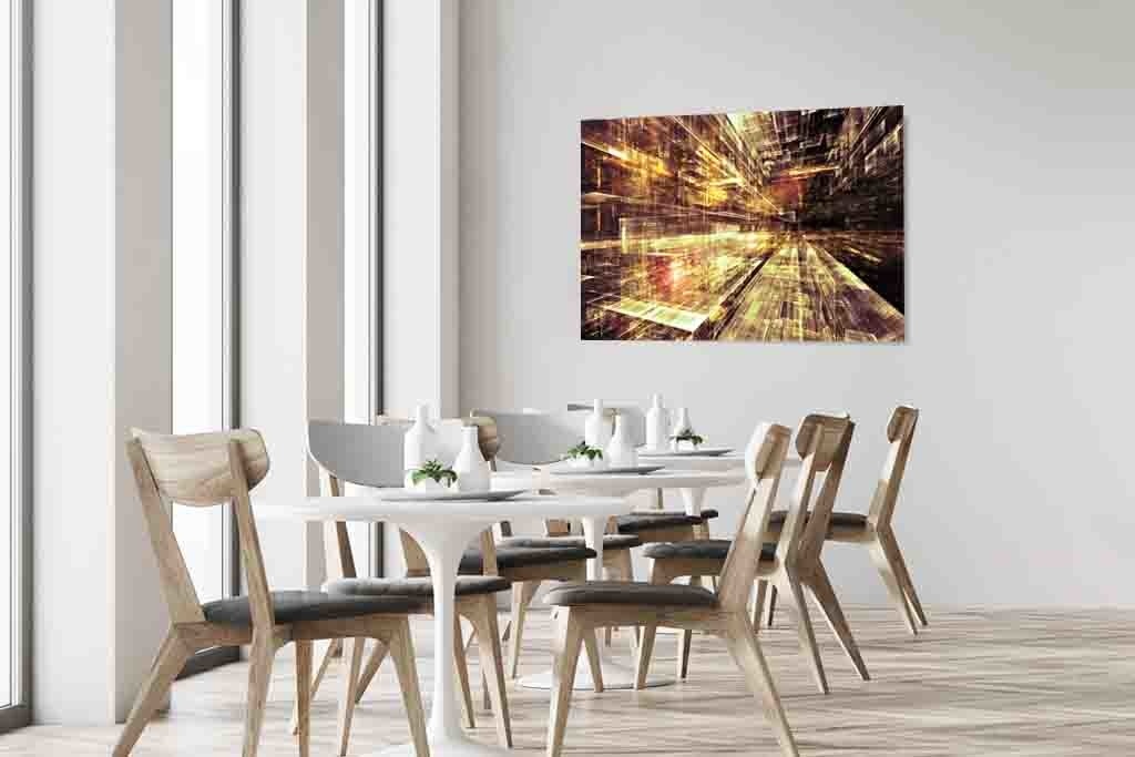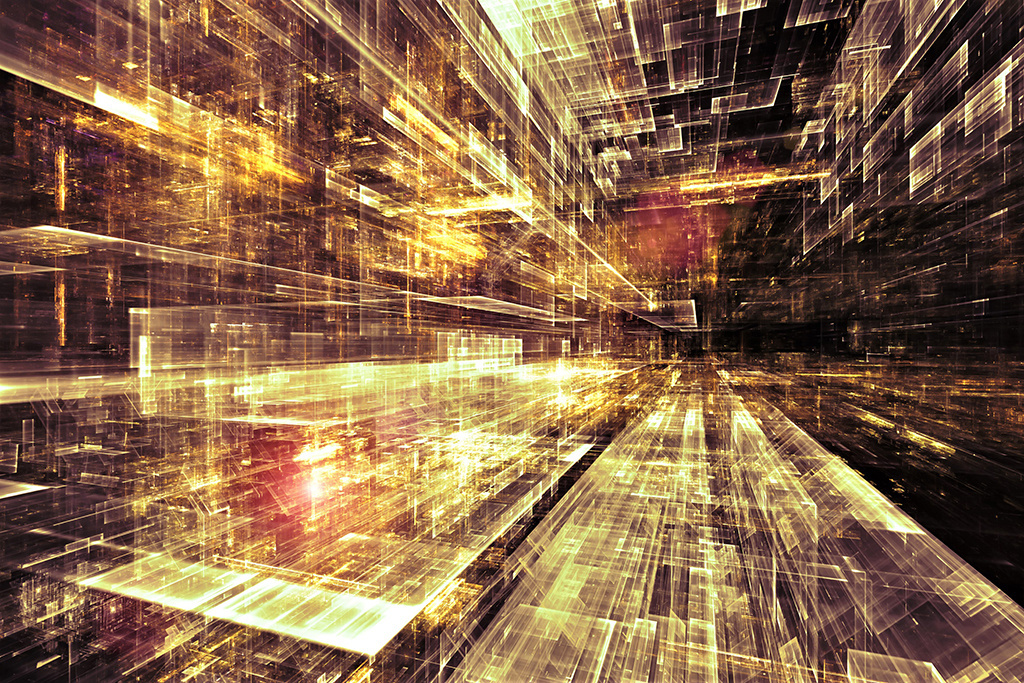 Bild einer virtuellen Stadt auf künstlerische Art und Weise. Man wird sozusagen in das Bild hineingezogen, das Funkeln in der Kunst gibt einen schönen Effekt.