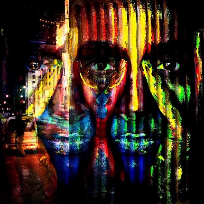 Schöne abstrakte bunte Bild einer Frau mit gefärbten Gesicht und Hände. Passt perfekt in ein modernes Interieur.
