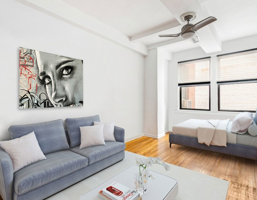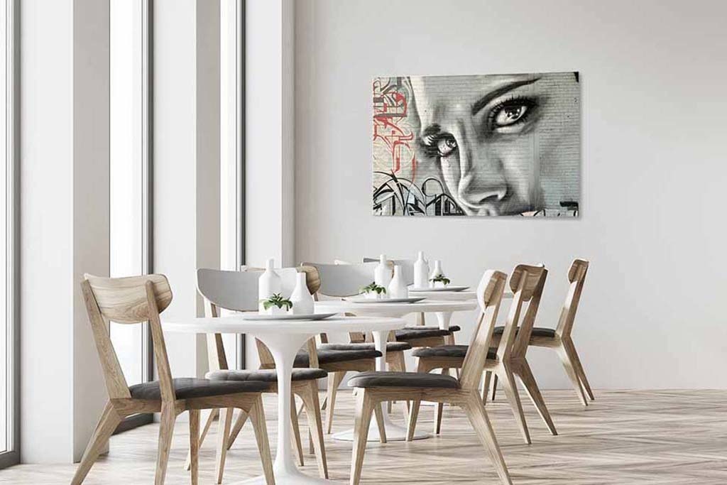 Die Fototafel hat rundum ein luxuriöses Aluminiumprofil auf der Rückseite und kann mit einem Schraubendaumen (Haken) an die Wand gehängt werden. Das hintere Profil sorgt für Stabilität und verhindert ein Verziehen der Verkleidung. Da das Profil 2 Zentimeter dick ist, wird ein schwebender Effekt Ihres Kunstwerks an der Wand erzeugt.