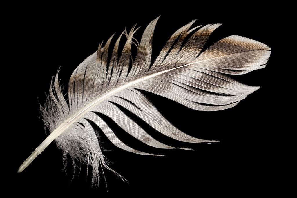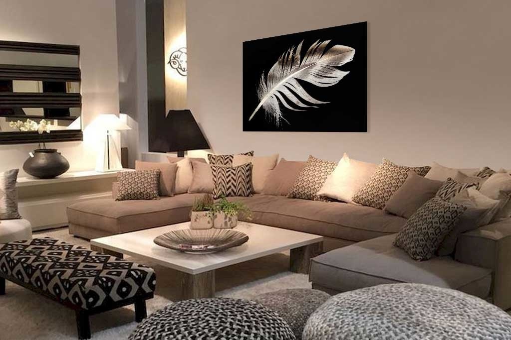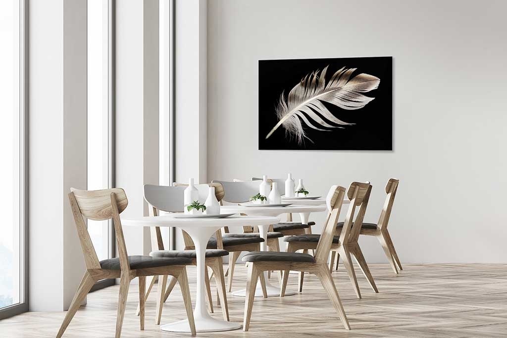 Weiße Feder, vor einem dunklen Hintergrund, sehr schickes Bild, passt in jedes Interieur.