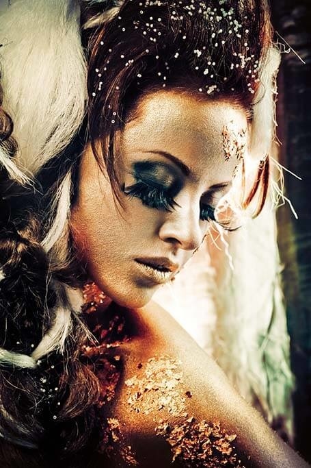 Bild einer glamourösen Frau. Durch den Glitzer, das Make-up und die große Frisur und die langen Wimpern scheint die Frau von der Bühne zu kommen. Die schönen Farben machen das Foto noch beeindruckender. Sieht in allen Räumen des Hauses oder im Büro gut aus. Passt in fast jedes Interieur.