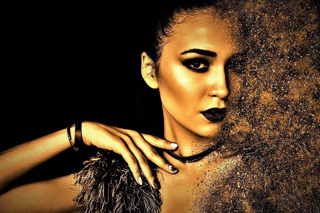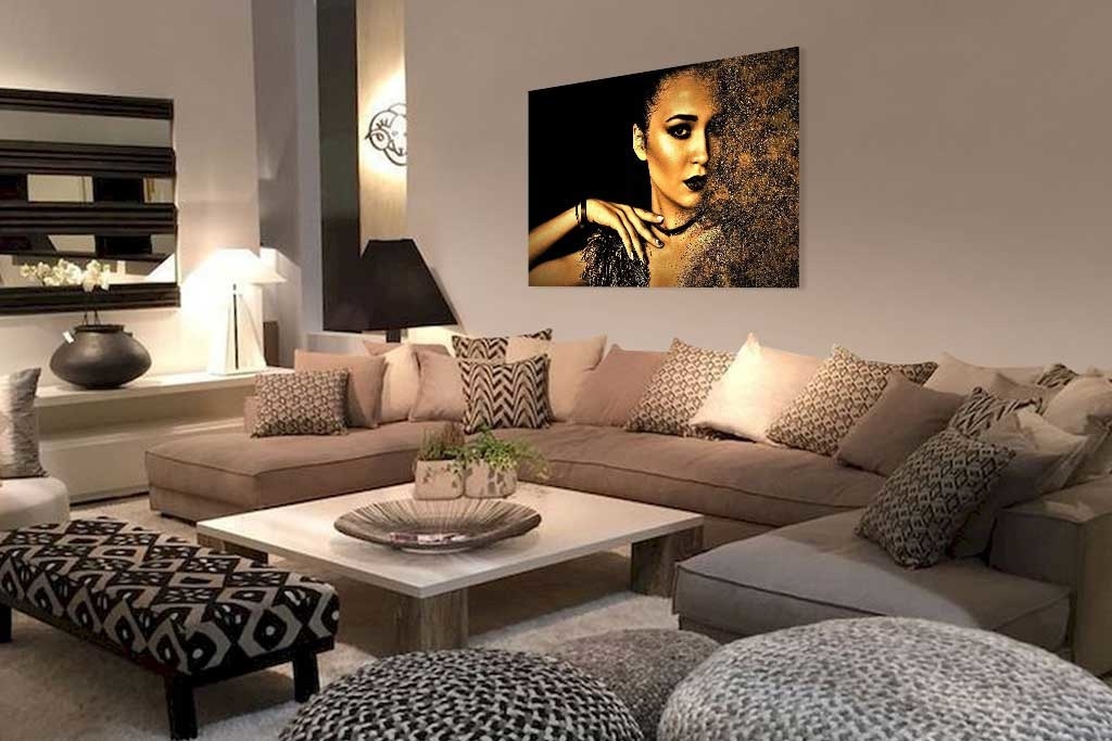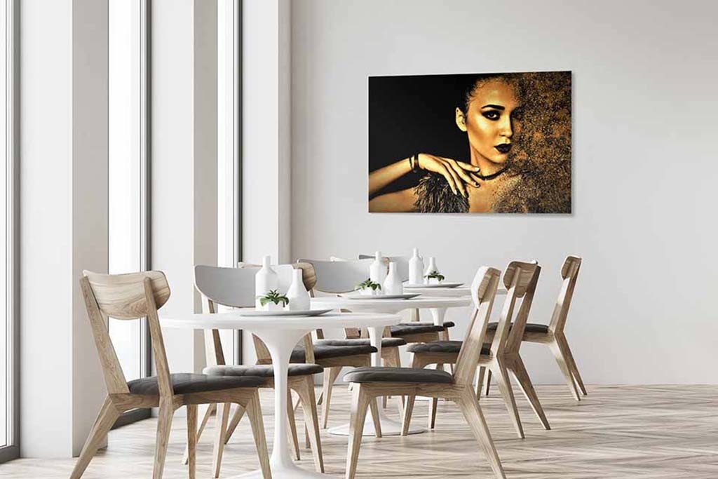 Dieses Bild zeigt eine Frau, die sich langsam in einer goldenen Staubwolke auflöst. Ihr schwarzer Schmuck und ihr Make-up passen wunderbar zu der goldenen Farbe auf ihrem Körper. Schön zu kombinieren mit anderen Bildern von goldenen Frauen. Passt zu fast jeder Einrichtung, moderner schicker Look.