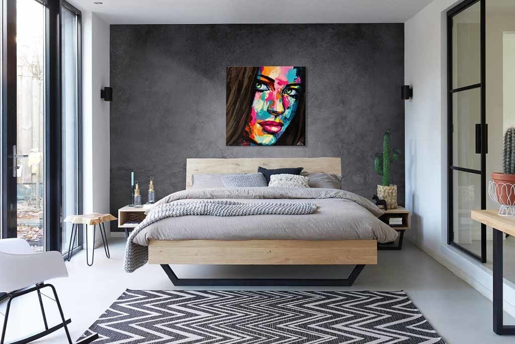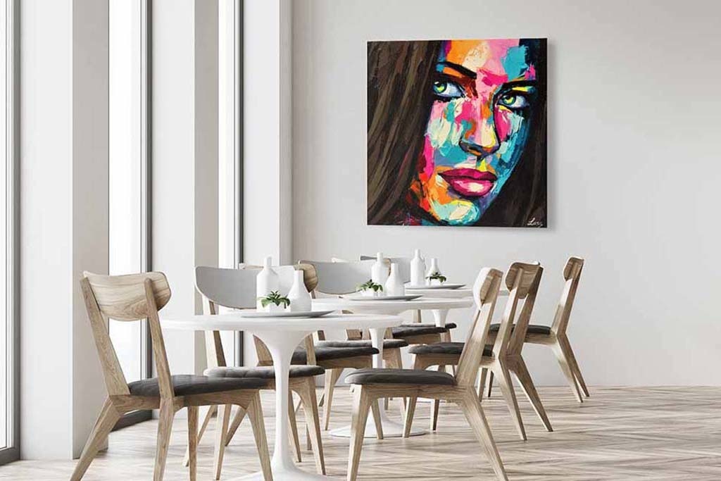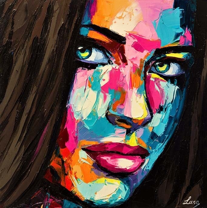 Bild eines gemalten Porträts mit bunten Farben. Das Gesicht der dargestellten Frau ist mit blauer, oranger und rosa Farbe dargestellt. Das Ergebnis ist ein Bild, das jede Wand zum Strahlen bringt. Sehr gut geeignet für eine Wand, die etwas Farbe vertragen könnte.