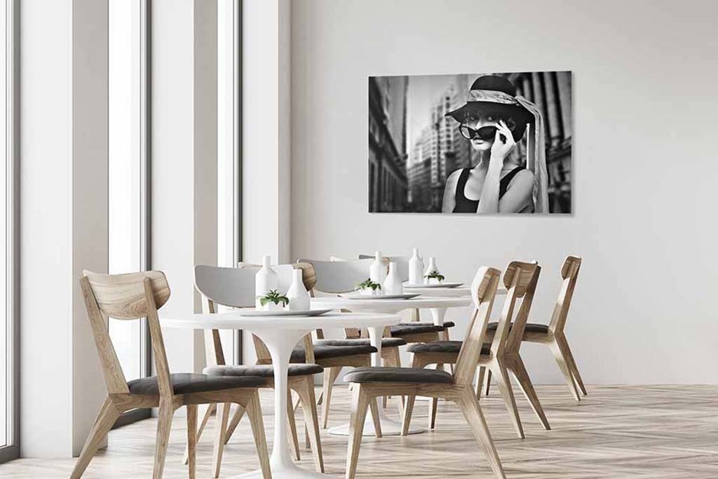 Durch die große Retro-Sonnenbrille und den Hut sieht die Frau dem Filmstar Audrey Hepburn sehr ähnlich. Der Schwarz-Weiß-Effekt macht das Bild sehr stilvoll. Schön zu kombinieren mit anderen Schwarz-Weiß-Fotoporträts. Passt zu fast jedem Wohnstil und macht z. B. im Wohnzimmer, Schlafzimmer oder Arbeitsbereich eine gute Figur.