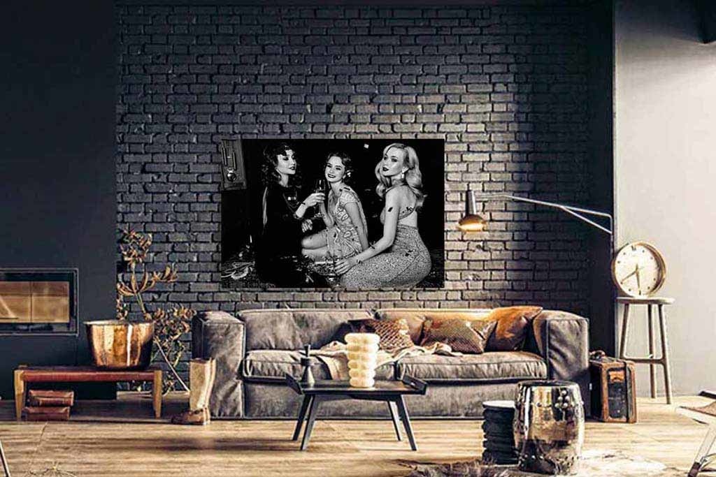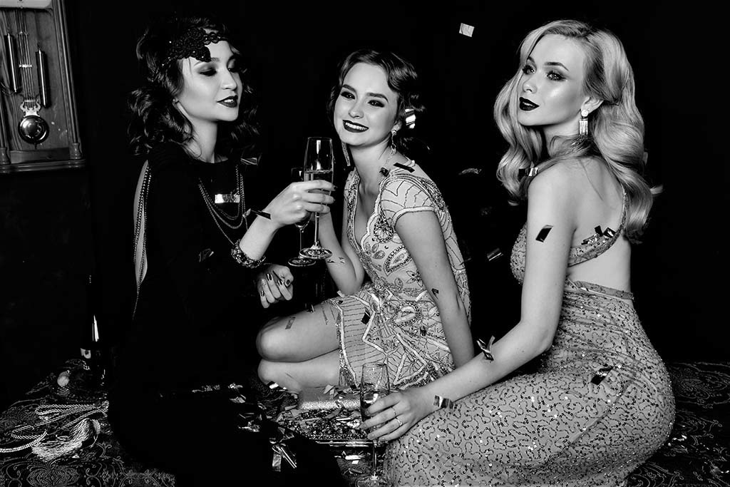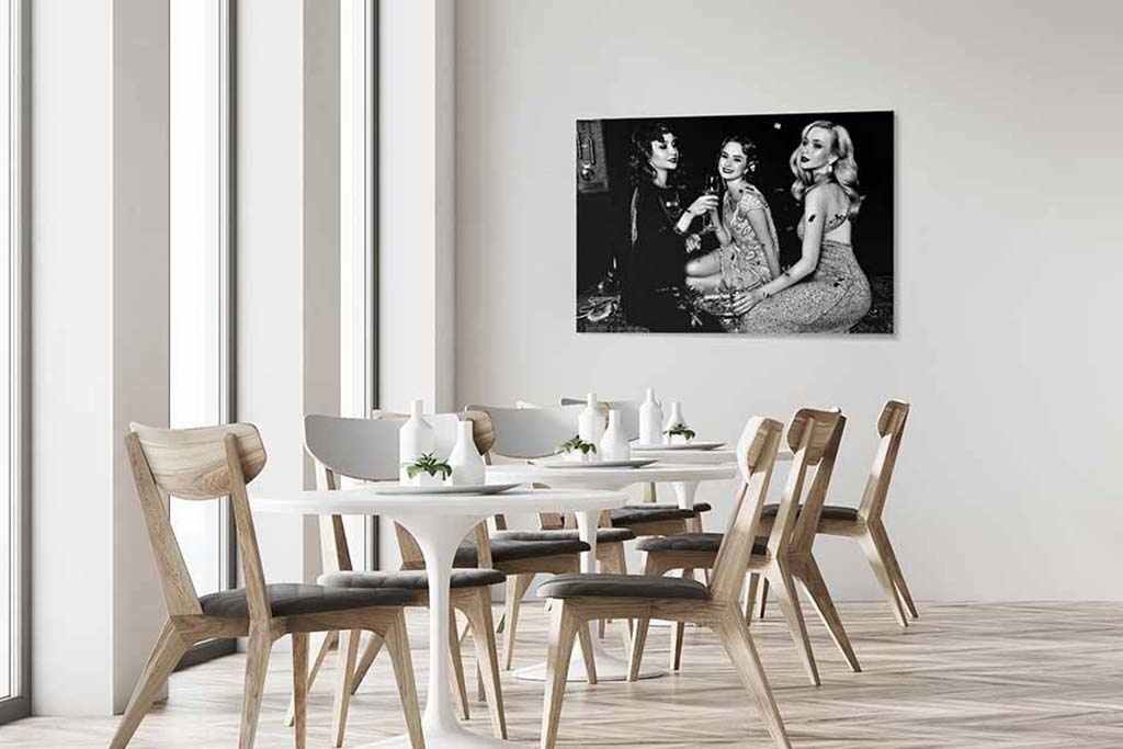 Schwarz-Weiß-Bild von drei Frauen auf einer Party. Die Frauen tragen klassische Partykleidung und haben einen Drink in der Hand. Kombinieren Sie mit anderen Schwarz-Weiß-Bildern von Frauen und erstellen Sie Ihre eigene Serie. Sieht in vielen Bereichen des Hauses gut aus, z. B. im Wohnzimmer.